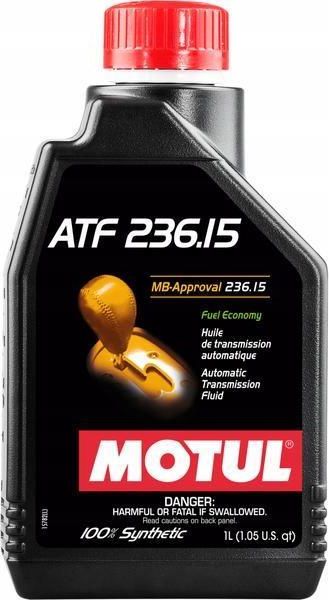 MOTUL ATF 236.15 1L Producent: MOTUL samochody Kategoria: Multi Synthetic Nr. katalogowy: 106954 Pojemność: 1L ATF 236.15W 100% syntetyczny o niskiej lepkości. Dedykowany do wszystkich tylnonapędowych i czteronapędowych samochodów osobowych, SUVów i lekkich pojazdów dostawczych Mercedes Benz wymagającymi oleju MB 236.15 (po roku 2010). Obowiązkowy w pojazdach Mercedes wyposażonych w 7 biegowe skrzynie (NAG2) oraz modele AMG, oraz do 5 biegowych skrzyń gdzie wymagana jest specyfikacja MB 236.15. Skrzynie 722.9 od numeru 2834527 (z silnikami 113, 152, 156, 157, 275, 279). Skrzynie 722.9 od numeru 2834527 (poza silnikami 113, 152, 156, 157, 275, 279, 629). Skrzynie 724.2. Posiada zatwierdzenia: MB 236.15