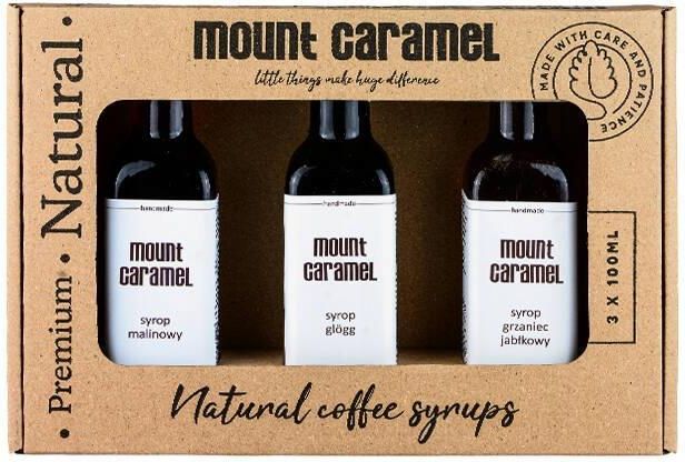 Zestaw syropów Mount Caramel stworzony z myślą o miłośnikach kawy, herbaty i słodkich deserów, pragnących dodać swoim specjałom wyjątkowego smaku i charakteru. Zestaw jest zapakowany w kartonik prezentowy i zawiera trzy smaki: malina, glogg oraz grzaniec jabłkowy, każdy zamknięty w 100ml szklanej buteleczce. Zestaw zawiera syropy: -Malina - Składniki: karmelizowany cukier, woda, świeży sok cytrynowy, świeży sok malinowy. -Glogg - Składniki: karmelizowany cukier, woda, cynamon, imbir, goździki, kardamon, anyż, świeża cytryna, sok śliwkowy i z aronii, świeża skórka pomarańczowa. -Grzaniec jabłkowy - Składniki: skarmelizowany cukier, woda, cynamon, goździki, sok jabłkowy NFC, sok gruszkowy NFC, kwasek cytrynowy.