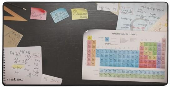 Małe podkładki pod mysz komputerową bywają irytujące – zaginające się rogi, wystrzępione brzegi… To już przeszłość! Natec Discoveries to bardzo duża podkładka o wymiarach 800x400mm, na której zmieści się nie tylko mysz, ale także klawiatur PODKŁADKA NIE TYLKO POD MYSZ Małe podkładki pod mysz komputerową bywają irytujące – zaginające się rogi, wystrzępione brzegi… To już przeszłość! Natec Science to bardzo duża podkładka o wymiarach 800x400mm, na której zmieści się nie tylko mysz, ale także klawiatura. Dzięki swojej dużej powierzchni podkładka zabezpiecza blat biurka przed uszkodzeniami a za sprawą doskonałej jakości wykonania służyć będzie użytkownikowi przez długi czas. UNIKATOWA I PRAKTYCZNA GRAFIKA Głównym wyróżnikiem Natec Science jest unikatowa grafika imitująca blat biurka z układem okresowych pierwiastków oraz stałymi fizykochemicznymi i podstawowymi wzorami z fizyki i chemii zapisanymi w formie notatek. Dzięki temu podkładka nie tylko ułatwia posługiwanie się myszką, ale także pomaga w pracy, zabawie i nauce będąc nieodzowną pomocą dla każdego ucznia. Dodatkowo żywa kolorystka sprawia, że podkładka stanie się ciekawym uzupełnieniem wystroju wnętrza. DOSKONAŁA JAKOŚĆ WYKONANIA Wierzchnia warstwa wykonana z wodoodpornej tkaniny zapewnia wysoką precyzję śledzenia ruchów myszy optycznej i laserowej oraz redukuje tarcia o powierzchnię. Podkładka wyposażona jest również w antypoślizgową warstwę na spodzie, która zapobiega przesuwaniu się produktu. Obszyte krawędzie podkładki zabezpieczają ją przed zniszczeniem.