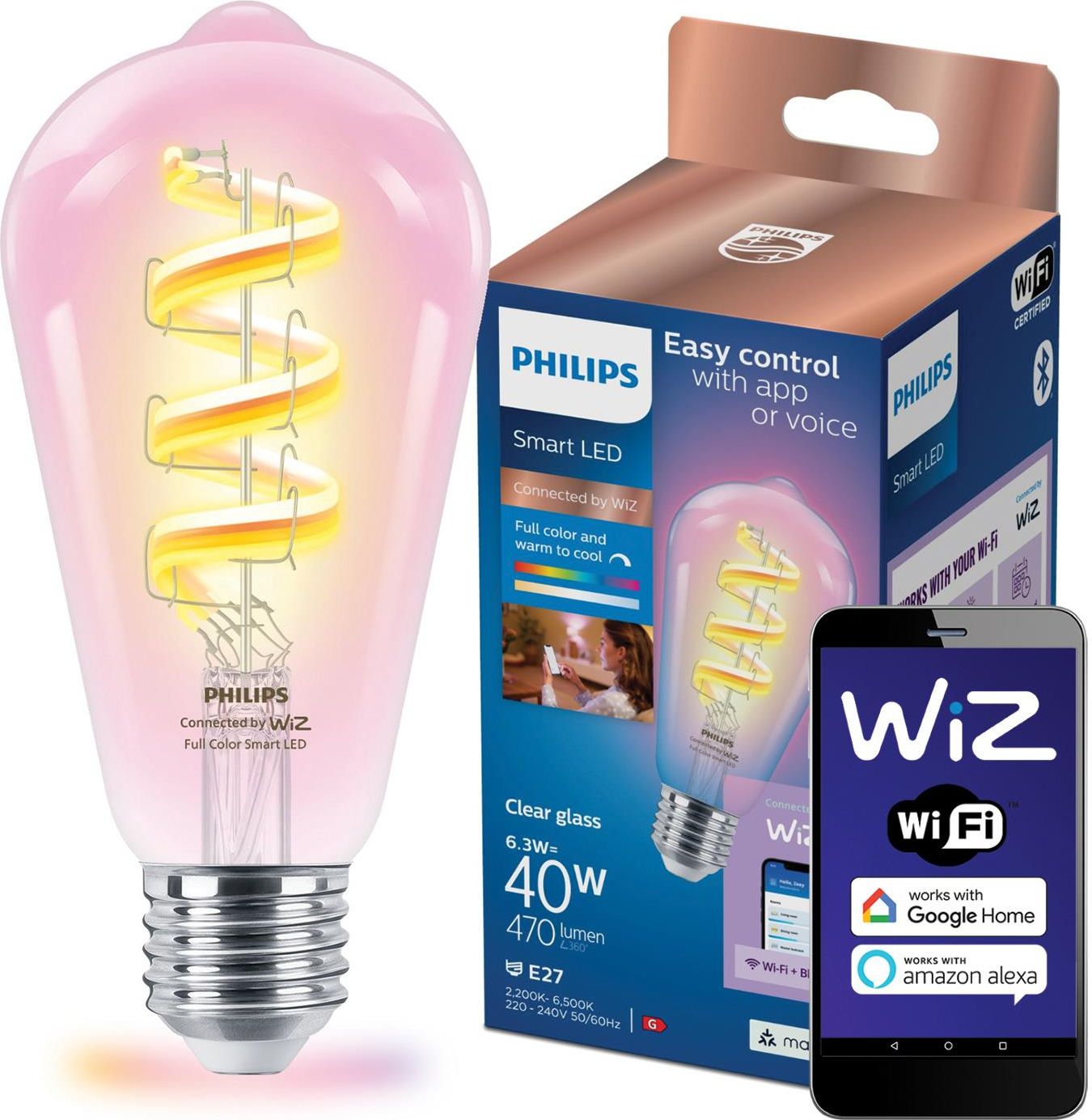 Philips Smart LED Żarówka filament E27 ST64 6,3 W (40 W), kolorowe światło Kiedy Edison wynalazł w latach 80. XIX wieku klasyczną żarówkę żarnikową, z pewnością nie był w stanie wyobrazić sobie, co firma Philips mogłaby z nią zrobić dzisiaj. Te inteligentne żarówki żarnikowe LED wyglądają świetnie nawet wtedy, gdy są wyłączone, ale prawdziwa magia zaczyna się dopiero po ich włączeniu. Wypełnij swoje pomieszczenia milionami kolorów i odcieni światła białego, od ciepłych po chłodne. Ciesz się klasycznym wyglądem tradycyjnych żarówek żarnikowych w estetyce vintage, czerpiąc jednocześnie korzyści z energooszczędnej technologii LED. Kolorowe inteligentne żarówki LED o wyglądzie oryginalnej, tradycyjnej żarówki Edisona Inteligentna żarówka z pełną gamą kolorów Do 470 lm Po prostu wkręć i korzystaj Sterowanie za pomocą aplikacji lub głosu Odkryj korzyści Światło dopasowane do potrzeb Przyciemniaj lub rozjaśniaj światło i wybieraj spośród wielu odcieni światła białego, od energetyzującego i zimnego po ciepłe i przytulne. Automatyzacja oświetlenia Zaprogramuj światła tak, by dostosować je do swojej codziennej lub tygodniowej rutyny lub korzystaj z automatycznego dostosowywania się światła do pory dnia. Łatwość sterowania Steruj światłami Philips Smart LED poprzez aplikację WiZ, głosowo dzięki  najbardziej znanym asystentom głosowym, za pomocą pilota WiZ lub standardowymi włącznikami światła. Oświetleniem możesz kontrolować z dowolnego miejsca, nawet spoza domu. Wyjątkowa atmosfera i miliony kolorów Korzystaj z 16 milionów kolorów i dynamicznych trybów oświetlenia, by wyczarować wyjątkową atmosferę w swoim domu. Wybieraj spośród gotowych trybów oświetlenia lub twórz własne sceny. Inteligentne oświetlenie Wi-Fi LED Philips Smart LED to szeroka gama inteligentnych żarówek LED działających na bazie systemu WiZ, opartego na sieci Wi-Fi. W prosty sposób wyczarujesz niepowtarzalny nastrój na każdą okazję, dostosujesz światło do wykonywanej czynności, pory dnia czy Twojego stylu życia. Wystarczy, że wkręcisz żarówkę i zainstalujesz aplikację WiZ na telefonie. Możesz sterować swoim oświetleniem zdalnie za pomocą telefonu, głosowo czy pilotem. Poznaj produkty białe światło (rozjaśniane i przyciemniane) białe światło (od zimnej do ciepłej bieli) kolorowe światło (16 milionów barw) @media only screen and (max-width: 720px){ .lnd_media { width: 100%!important; } } .lnd_article-main { width: 1050px; margin: 0 auto; } @media only screen and (max-width: 720px) { .lnd_article-main { width: 100%!important; } } .lnd_article-main .lnd_object .lnd_text { padding: 1em 4em 1em 4em; }