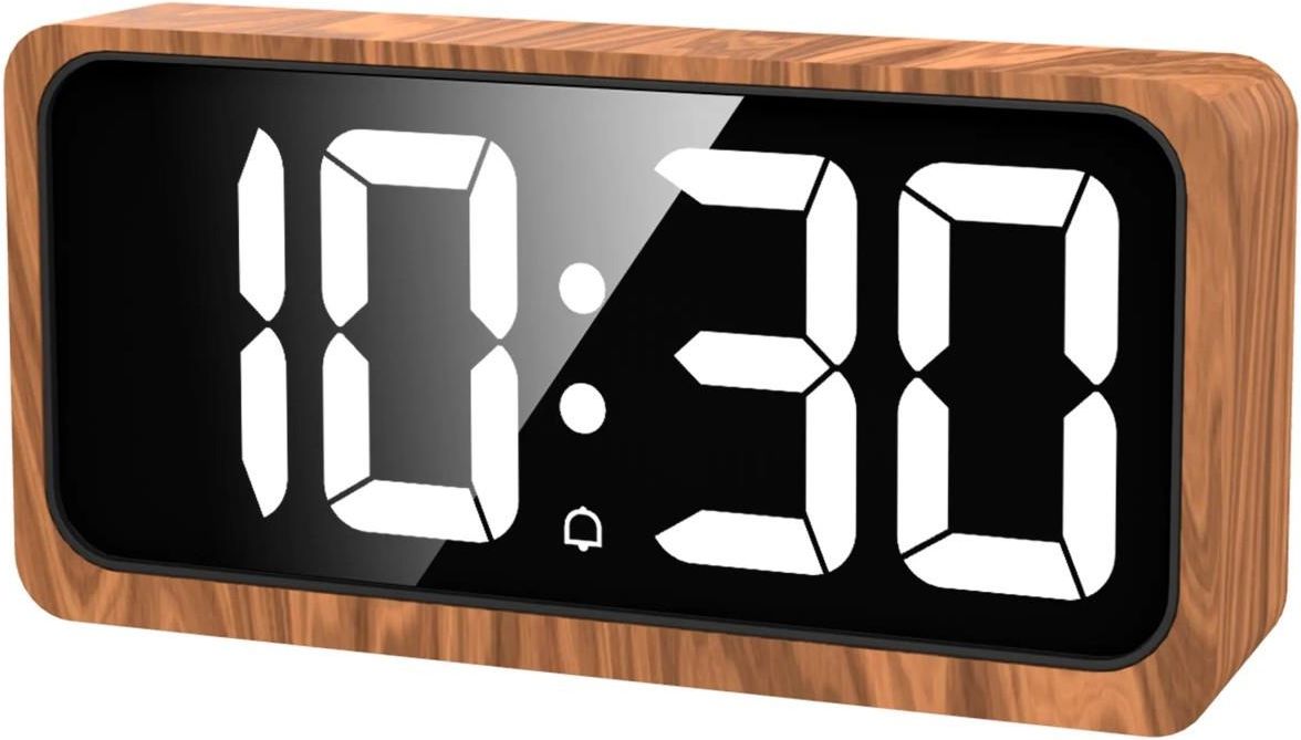 Zegar biurkowy budzik z wyraźnymi białymi cyframi LED. Długość 17,7 cm. Alarm / budzik. Termometr Regulacja jasności podświetlenia. Zasilanie sieciowe i bateryjne. Średniej wielkości brązowy budzik zegar stołowy szafkowy do biura pokoju sypialni