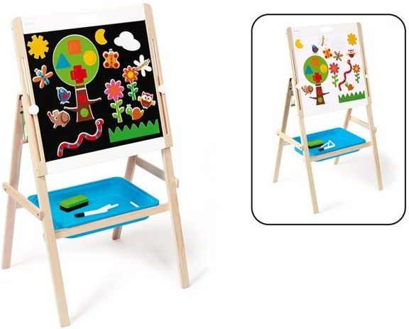 Witaj w klasie Scratch! Dwustronna duża tablica magnetyczna, to świetny pomysł na kreatywną zabawę Twoich Pociech. Tablica jest idealnym miejscem na naukę pierwszych literek oraz cyferek. To także świetne miejsce do rozwijania zmysłu artystycznego przez wykonywanie wspaniałych rysunków. Tablica ma regulowaną wysokość od 87 do 120 cm. Z jednej strony to tradycyjna czarna tablica kredowa. Z drugiej struny to suchościeralna biała tablica pozwalająca na pisanie markerami oraz zabawę z magnesami. Obie strony są magnetyczne! W zestawie znajdziemy zabawne magnesy, 3 kredki, 1 markera oraz gumkę. Pod deską znajduje się rolka papieru do rysowania (5 m), a do dyspozycji jest również półka do przechowywania wszystkich akcesoriów do rysowania. Wiek: 3+ Wymiary produktu: 65 x 50 x H87-120cm Projektant: Etienne Ghilbert USZKODZONE OPAKOWANIE JAK NA ZDJĘCIU, RABAT 10% dodany na fakturze , PRODUKT PEŁNOWARTOŚCIOWY