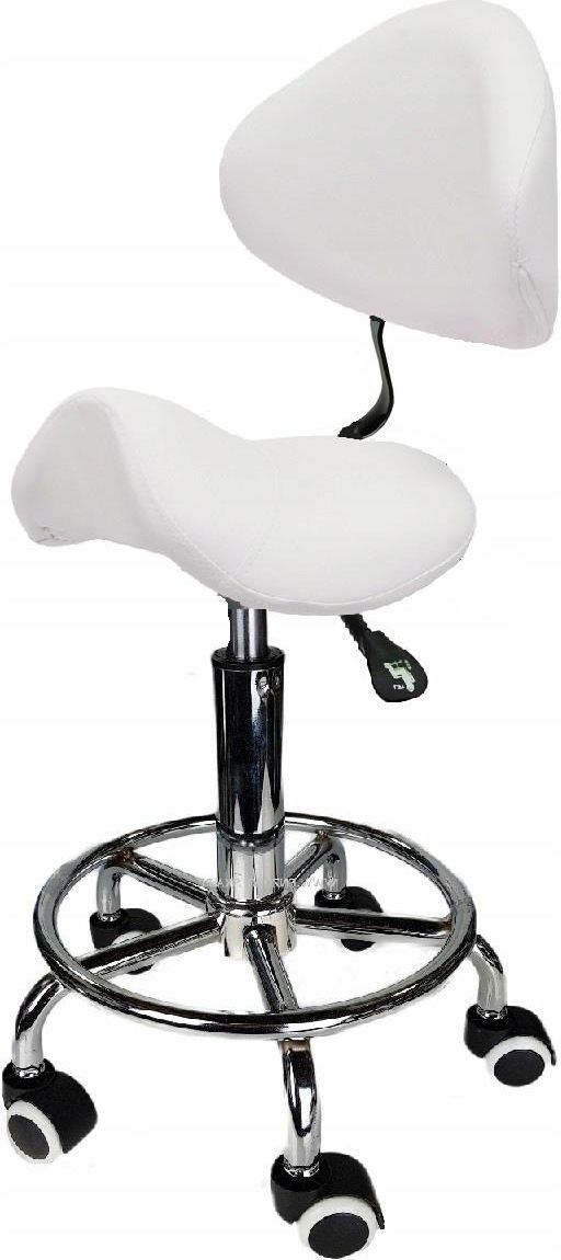 Taboret kosmetyczny siodło z oparciem - Rodi Prezentujemy Państwu wygodny, ekskluzywny i stabilny taboret kosmetyczny z oparciem oraz profilowanym siedziskiem, na pięcioramiennej bardzo stabilnej podstawie z miejscem na nogi. Można regulować oparcie i dostosować jego wysokość do żądanej wysokości. …