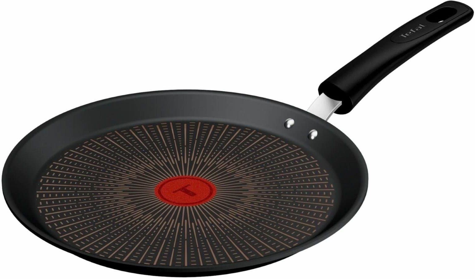 Patelnia Tefal Excellence Fusion 25 cm to wysokiej jakości patelnia do naleśników o tytanowej powłoce Extra Life 9, wyjątkowo trwała i odporna na zarysowania, nawet przy użyciu metalowych akcesoriów. Dzięki technologii Fusion Core i wskaźnikowi ciepła Thermo-Signal zapewnia równomierne nagrzewanie i idealne smażenie na każdej kuchence.