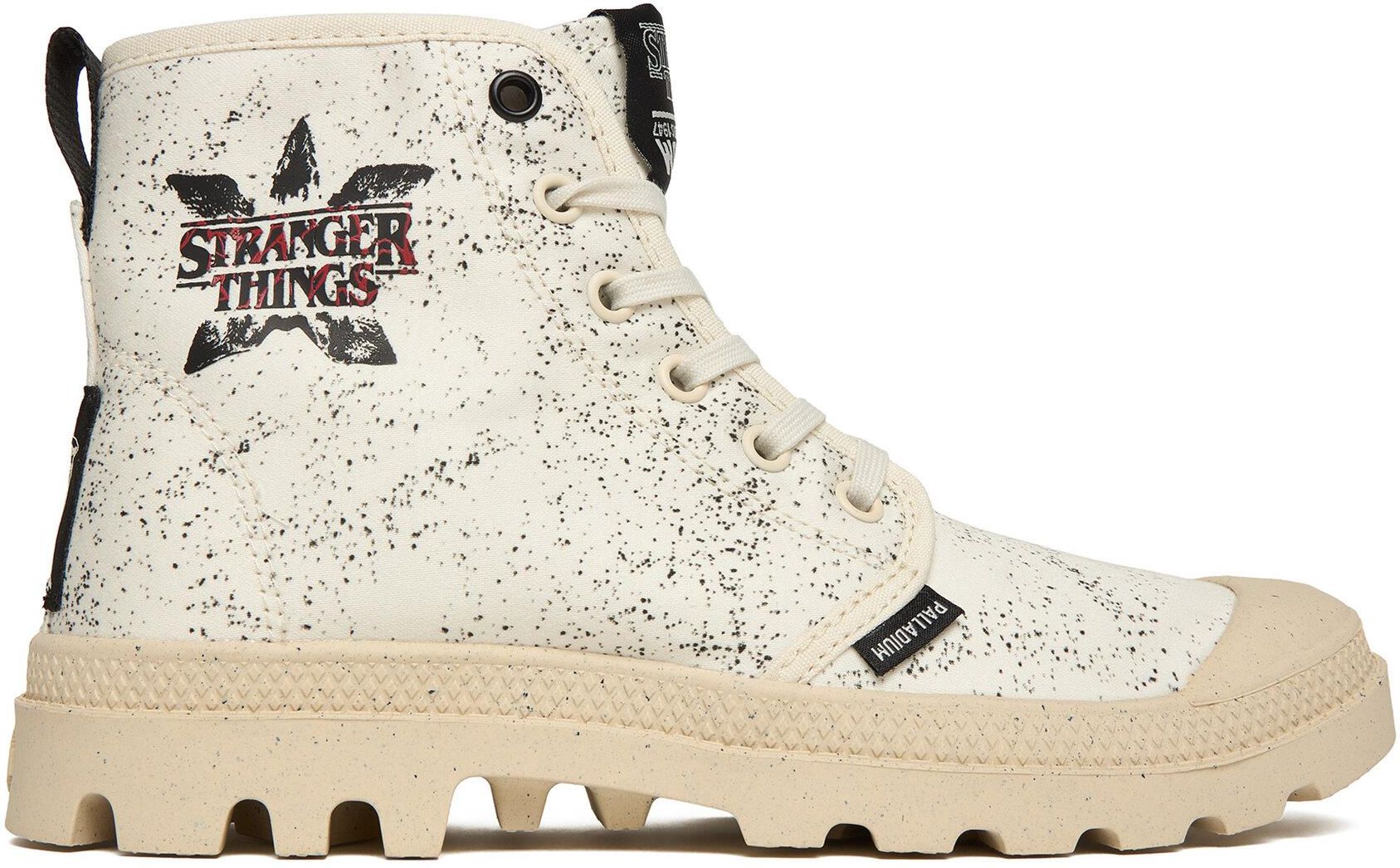 Palladium Pampa Demodog 74497-180-M Cream White Model Pampa Demodog 74497-180 Cream White to wyjątkowa wersja klasycznego modelu Pampa, stworzona we współpracy z serialem Stranger Things . Cholewka z organicznej bawełny w odcieniu „kurzowej bieli” (off-white) została dodatkowo postarzana nadrukiem, ozdobiona motywami pazurów i grafiką „claw marks”, które przywołują klimat Demodoga ze świata Hawkins. Wewnętrzna podszewka z nadrukiem gazetowym (newspaper inspired lining) oraz elementy graficzne (emblemat Demodog na pięcie, odwrócone logo Palladium) podkreślają narracyjny charakter tej edycji. Standardowa gumowa podeszwa zapewnia przyczepność i trwałość, a konstrukcja Strobel lasting daje elastyczność i dobrą adaptację do stopy. Zapięcie na klasyczne sznurowadła pozwala na regulację dopasowania. Wysokość podeszwy wynosząca ok. 25 mm dodaje delikatne podbicie, zachowując miejską sylwetkę. To but dla fanów, kolekcjonerów i tych, którzy chcą nosić element popkultury w codziennym stylu.