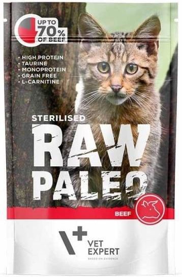 Vet Expert - Ekspert rekomendowany przez lekarzy weterynarii  Marka Vet Expert posiada w swojej ofercie bogatą i zróżnicowaną gamę preparatów dla zwierząt, są to produkty takie jak: suplementy diety, preparaty pielęgnacyjne, wysokiej jakości karma oraz inne produkty weterynaryjne.  Vet Expert to marka godna zaufania.  RAW PALEO STERILISED BEEF - mokra karma dla kotów sterylizowanych - wołowina   Karma mokra RAW PALEO Sterilised dla kotów jest kompletną i zbilansowaną pełnoporcjową karmą bytową, przeznaczoną dla kotów dorosłych z predyspozycjami do nadwagi lub otyłości, a także kotów wysterylizowanych i wykastrowanych. Karma została wzbogacona w L-karnitynę oraz jest jednobiałkowa, co oznacza, że wszystkie składniki pochodzenia zwierzęcego użyte do wytworzenia karmy pochodzą z wołowiny. Nasz produkt wyróżnia  Skład Zawartość w 100g: wołowina i podroby z wołowiny 68% (serca, mięso wołowe, wątroba, płuca), rosół z wołowiny 29%, słodkie ziemniaki 2%, minerały 1 % Stosunek ilości mięsa mięśniowego do podrobów wynosi 50%/50%. Analiza składu białko 10,6%, tłuszcz 6,7%, włókno surowe 0,5%, popiół surowy 2,1%, wilgotność 78,0% Fosfor: 0,15%-0,19% Wapń: 0,20%-0,26% Dodatki  Dodatki żywieniowe w kg: witamina D3 200 IU, cynk (jako jednowodny siarczan cynku) 25 mg, mangan (jako siarczan manganu II, jednowodny) 1,4 mg, jod (jako jodan wapnia, bezwodny) 0,75 mg, DL- metionina 20mg, L-karnityna 200mg, tauryna 1500mg Dawkowanie