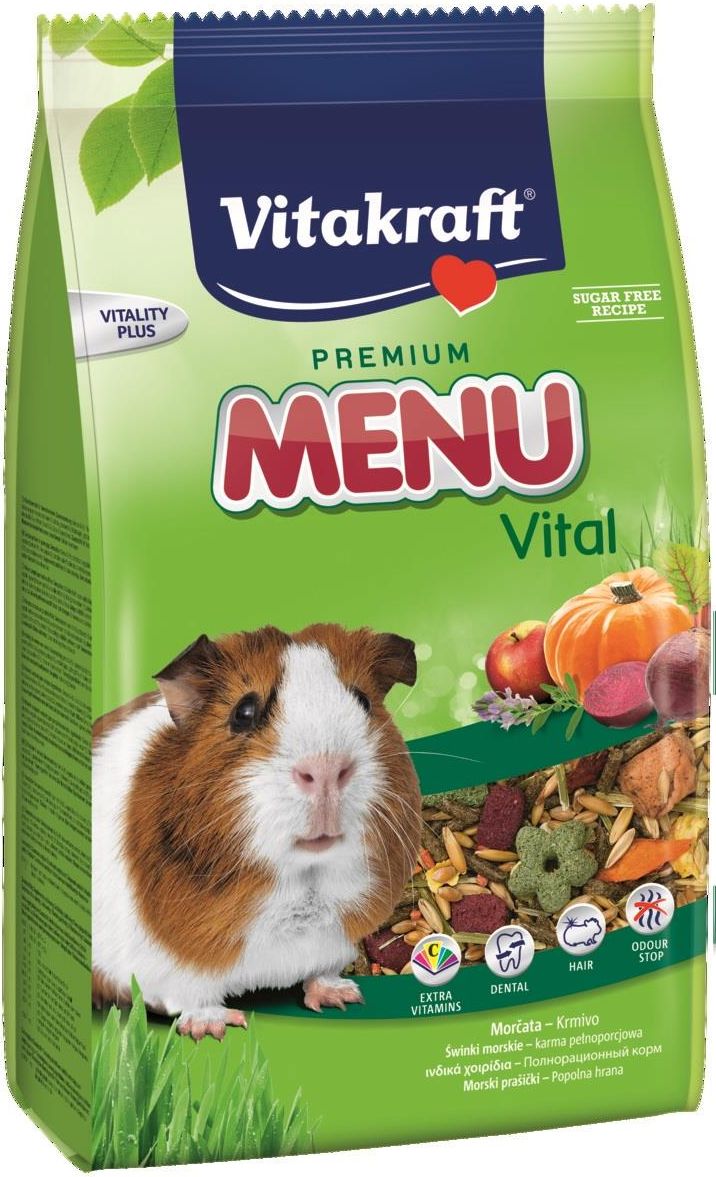 MENU VITAL karma dla świnki morsksiej 400gKompletna karma dla gryzoni, specjalnie dostosowana do każdego gatunku. Mieszanka naturalnych składników pomaga w utrzymaniu zrównoważonej diety. Karma posiada specjalną kombinację aktywnych składników zapobiegającą wytwarzaniu nieprzyjemnych zapachów.