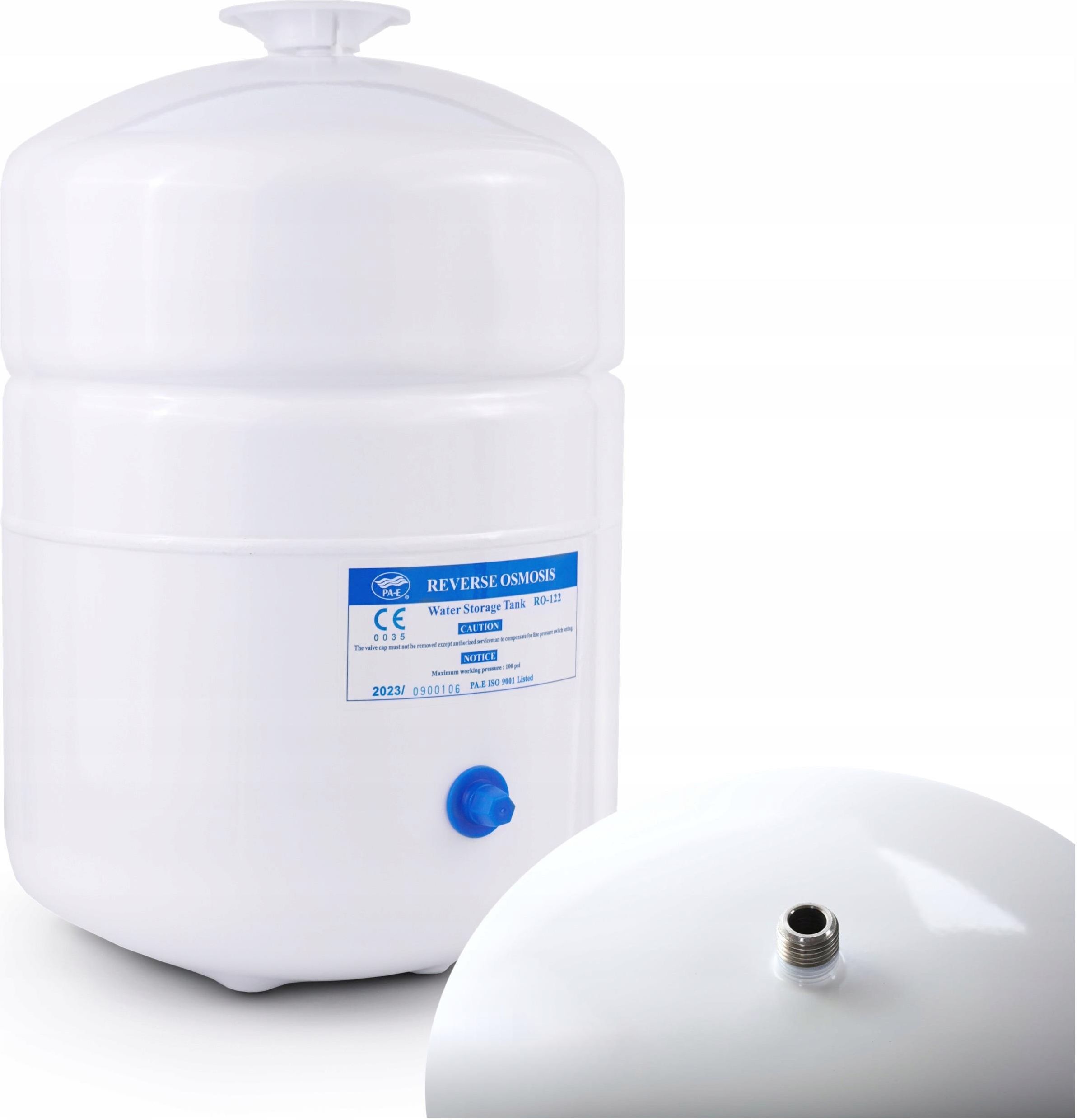 Zbiornik Wody Metalowy 3,2 galona do Filtra Wody Systemu Odwróconej Osmozy Metalowy zbiornik na wodę osmotyczną o pojemności 3,2 galona, Zbiornik 3,2G = 12L to niezawodne i trwałe rozwiązanie do przechowywania czystej wody, spełniające najwyższe standardy jakości i bezpieczeństwa. Wybierając ten produkt, inwestujesz w zdrowie i komfort użytkowania. Dedykowany do przechowywania wody z systemów osmotycznych, zapewniając czystą i bezpieczną wodę wolną od zanieczyszczeń. Dzięki wysokiej jakości materiałom i zaawansowanym technologiom, zbiornik ten gwarantuje długowieczność oraz bezpieczeństwo użytkowania. Parametry techniczne Pojemność zbiornika brutto: 12 litrów Pojemność zbiornika netto 8L Waga pustego zbiornika z opakowaniem: 2,82 kg Wysokość zbiornika: 36,6 cm Szerokość zbiornika: 24,4 cm Wysokość podstawy zbiornika: nie dotyczy Maksymalna temperatura wody: 40°C Maksymalne ciśnienie robocze: 6,9 bar Certyfikat Europejski: tak Dwukładnikowy podkład epoksydowy Zbiornik wykonany jest ze stali nierdzewnej pokrytej dwukładnikowym podkładem epoksydowym, co zwiększa jego odporność na korozję i uszkodzenia mechaniczne. Warstwa farby poliuretanowej Dodatkowa warstwa farby poliuretanowej chroni zbiornik przed uszkodzeniami i wydłuża jego żywotność, zapewniając trwałość nawet w trudnych warunkach. Wkładka z polipropylenu PP Wnętrze zbiornika zawiera wkładkę z polipropylenu PP oraz wysokiej jakości membranę z chlorobutylu, które gwarantują czystość i bezpieczeństwo przechowywanej wody. Certyfikaty NSF i Europejski Zbiornik posiada certyfikaty NSF oraz Europejski, co świadczy o jego wysokiej jakości oraz spełnieniu międzynarodowych standardów bezpieczeństwa. Zgodność z wymaganiami FDA Zbiornik jest zatwierdzony przez amerykańską Agencję Żywności i Leków (FDA), co potwierdza jego bezpieczeństwo w kontakcie z wodą pitną. Czysta i bezpieczna woda Dzięki zaawansowanym materiałom i technologii, zbiornik gwarantuje wodę wolną od zanieczyszczeń, bez smaku i zapachu, co jest niezbędne do zdrowego życia. Trwałość i niezawodność Zastosowane materiały i konstrukcja zbiornika zapewniają jego długą żywotność oraz odporność na uszkodzenia, co oznacza mniejszą potrzebę konserwacji i wymiany. Wysoki standard jakości Certyfikaty NSF i Europejski oraz zgodność z wymaganiami FDA potwierdzają wysoką jakość i bezpieczeństwo zbiornika, co daje użytkownikowi pewność co do jego niezawodności. Wszechstronność zastosowania Zbiornik może być stosowany w różnych systemach filtracji molekularnej, co czyni go uniwersalnym rozwiązaniem dla różnych potrzeb.