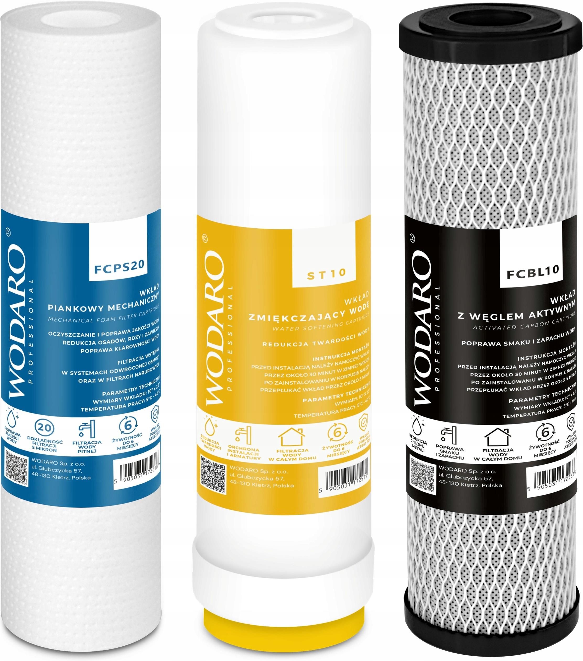 Zestaw Wkładów do FIltra Wody na Cały Dom 3-stopniowy Zmiękczacz WodaRO 10" Filtracja wody mechaniczna | zmiękczająca | węglowa Idealny do 3-stopniowych filtrów podzlewozmywakowych, narurowych oraz systemów centralnych na cały dom, mieszkanie Uniwersalny rozmiar 10” – pasuje do większości obudów na …