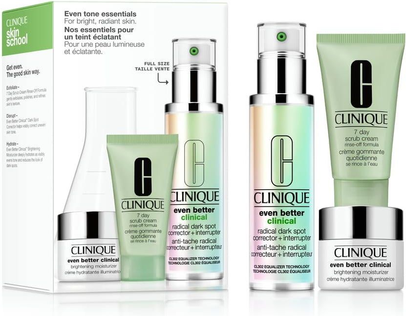 3 specjalistów w dziedzinie pielęgnacji skóry, którzy zadbają o jej promienny wygląd. WŁAŚCIWOŚCI Wyrównaj koloryt skóry w najlepszy sposób, dzięki tym ulubionym produktom z popularnej serii Skin School. Even Better Clinical™ Radical Dark Spot Corrector + Interrupter pomaga widocznie zmniejszyć przebarwienia, takie jak ślady po niedoskonałościach i łagodzi podrażnienia, które mogą prowadzić do powstawania ciemnych plam w przyszłości. 7 Day Scrub Cream Rinse-Off Formula delikatnie złuszcza, wygładza i poprawia strukturę skóry. Even Better Clinical™ Brightening Moisturizer głęboko nawilża i widocznie zmniejsza widoczność ciemnych plam. ZESTAW ZAWIERA Pełnowymiarowe serum Even Better Clinical™ Radical Dark Spot Corrector + Interrupter 1.7oz/50ml 7 Day Scrub Cream Rinse-Off Formula, 1.0oz/30ml Even Better Clinical™ Brightening Moisturizer, 0.5oz/15ml Rodzaje skóry: Wszystkie Filozofia Clinique Bez parabenów. Bez ftalanów. Bez zapachu. Po prostu szczęśliwa skóra. Składniki + Water\Aqua\Eau, Tridecyl Stearate, Tridecyl Trimellitate, Dipentaerythrityl Hexacaprylate/Hexacaprate, Butylene Glycol, Glyceryl Stearate, Cocos Nucifera (Coconut) Oil, Caprylic/Capric Triglyceride, Silica, Cetearyl Alcohol, Ceteareth-20, Sorbitol, Hexyldecyl Stearate, Bisabolol, Disodium Cocoamphodipropionate, Triethanolamine, Oleth-10 Phosphate, Caprylyl Glycol, 1, 2-Hexanediol, Stearyl Alcohol, Carbomer, Disodium Edta, Phenoxyethanol, Potassium Sorbate, Chlorphenesin Rds Product Name: Even Better Brightening Moisturizer Division: Cl (Clinique)Ingredients: Water\Aqua\Eau, Butylene Glycol, Octyldodecyl Myristate, Dimethicone, Di-C12-15 Alkyl Fumarate, Isopropyl Isostearate, Glyceryl Stearate, Diisostearyl Malate, Peg-100 Stearate, Peg-8, Glycerin, Ascorbyl Glucoside, Butyrospermum Parkii (Shea) Butter, Tribehenin, Cetyl Alcohol, Acetyl Glucosamine, Sodium Hyaluronate, Dipotassium Glycyrrhizate, Sucrose, Caffeine, Tocopheryl Acetate, Cucumis Sativus (Cucumber) Fruit Extract, Camellia Sinensis Leaf Extract, Saccharomyces Lysate Extract, Aspergillus Ferment, Algae Extract, Helianthus Annuus (Sunflower) Seed Extract, Hordeum Vulgare Extract\Extrait D'Orge, Yeast Extract\Faex\Extrait De Levure, Trametes Versicolor Extract, Salicylic Acid, Cholesterol, Propylene Glycol Dicaprate, Cetearyl Alcohol, Behenyl Alcohol, Cetearyl Glucoside, Xanthan Gum, Potassium Hydroxide, Sodium Hydroxide, Disodium Phosphate, Sodium Phosphate, Citric Acid, Dimethoxytolyl Propylresorcinol, Sorbitan Oleate, Polysilicone-11, Dicetyldimonium Chloride, Hexylene Glycol, Polysorbate 80, Acrylates/C10-30 Alkyl Acrylate Crosspolymer, Caprylyl Glycol, Acrylamide/Sodium Acryloyldimethyltaurate Copolymer, Isohexadecane, Phosphatidylcholine, Disodium Edta, Bht, Chlorphenesin, Phenoxyethanol, Sodium Benzoate, Potassium Sorbate Rds Product Name: Even Better Ds Corrector+Intrrptor Division: Cl (Clinique)Ingredients: Water\Aqua\Eau, Cyclopentasiloxane, Dimethicone, Yeast Extract\Faex\Extrait De Levure, Polysilicone-11, Isododecane, Butylene Glycol, Trametes Versicolor Extract, Ascorbyl Glucoside, Peg-10 Dimethicone, Saccharomyces Lysate Extract, Helianthus Annuus (Sunflower) Seed Extract, Camellia Sinensis Leaf Extract, Scutellaria Baicalensis Root Extract, Morus Bombycis (Mulberry) Root Extract, Cucumis Sativus (Cucumber) Fruit Extract, Oryza Sativa (Rice) Bran Extract, Hordeum Vulgare Extract\Extrait D'Orge, Triticum Vulgare (Wheat) Germ Extract, Dimethoxytolyl Propylresorcinol, Sodium Hyaluronate, Caffeine, Glycyrrhetinic Acid, Sodium Rna, Salicylic Acid, Isohexadecane, Propylene Glycol Dicaprate, Caprylyl Glycol, Cholesterol, Squalane, Di-C12-18 Alkyl Dimonium Chloride, Peg-6, Acrylamide/Sodium Acryloyldimethyltaurate Copolymer, Ammonium Acryloyldimethyltaurate/Vp Copolymer, Polysorbate 20, Sodium Hydroxide, Sorbitan Oleate, Polysorbate 80, Disodium Edta, Tromethamine, Hexylene Glycol, Tocopheryl Acetate, Sodium Sulfite, Sodium Metabisulfite, Phenoxyethanol, Potassium Sorbate, Sodium Benzoate, Yellow 5 (Ci 19140), Yellow 6 (Ci 15985) Pamiętaj, że lista składników może się różnić w zależności od serii produktu. Najbardziej aktualną listę znajdziesz na opakowaniu produktu.