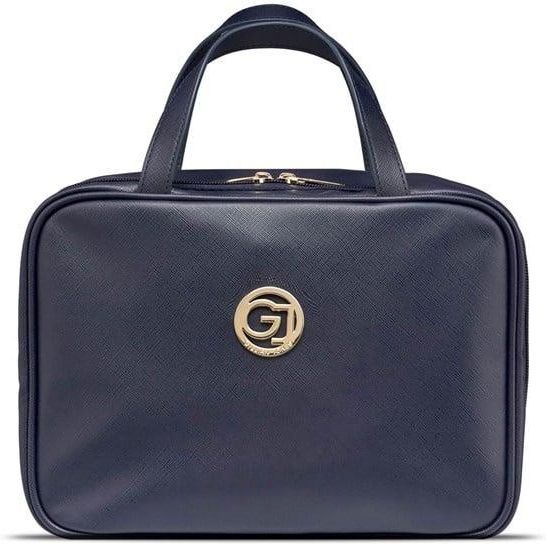 Zrównoważona kosmetyczka z tworzywa sztucznego pochodzącego w 100% z recyklingu, z funkcją zawieszania, wykonana z ciemnoniebieskiego PU i złotym emblematem GJ z przodu. Kosmetyczka ma fantastyczny design z 2 przezroczystymi wewnętrznymi przegrodami na suwak, które zapewniają dobry przegląd …