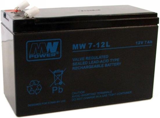 Akumulator MW Power MW 7-12L 12V 7,0 Ah AGM Parametry techniczne Napięcie: 12 V Pojemność: 7,0 Ah Typ: VRLA - AGM Waga: 2,2 kg Żywotność: 6 - 9 lat Wymiary Długość: 151 mm Szerokość: 65 mm Wysokość: 94 mm Wys. całkowita: 100 mm Konektor: 6,3 mm Technologia AGM – kwasowe akumulatory bezobsługowe, z elektrolitem uwięzionym w separatorze z maty szklanej. Typ: szczelne akumulatory kwasowo-ołowiowe, z zaworami bezpieczeństwa. Zastosowanie Telekomunikacja Energetyka Przemysł Medycyna Do awaryjnego zasilania w Centralach telefonicznych Stacjach bazowych i przekaźnikowych Siłowniach prądu stałego Zasilaczach TV kablowych Oświetleniu ewakuacyjnym Systemach alarmowych UPS-ach o mocach 1-800kVA Charakterystyka Akumulatory MW Power serii MW są przeznaczone do stosowania zarówno w systemach zasilania awaryjnego jak i innych aplikacjach w których akumulator pracuje cyklicznie. Preferowane zastosowania akumulatorów tej serii to: zasilanie rezerwowe w UPS, w systemach automatyki oraz jako źródło energii w urządzeniach przenośnych, zasilanie silników i innych urządzeń w trybie pracy cyklicznej. Dla rozładowań 50% do 500 cykli pracy.