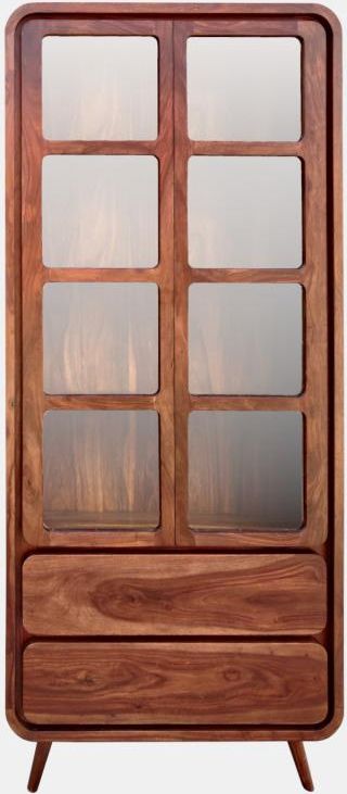 Opis produktu Realizacja zamówienia może potrwać od 21 do 90 dni roboczych. Zalecamy potwierdzenie dokładnego terminu przed złożeniem zamówienia. Witryna Halina to witryna o wysokości 200 cm i szerokości 90 cm, która świetnie sprawdzi się we wnętrzach w stylu retro i vintage. Swój niepowtarzalny wygląd zawdzięcza ręcznemu wykonaniu. Zrobiona z litego drewna w dwóch wariantach z mango indyjskiego z wykończeniem w kolorze: bursztyn lub karmel, albo palisandru indyjskiego w kolorach: miód, czekolada i krowa. Ten specjalnie zaprojektowany mebel ma eleganckie przeszklone drzwi, cztery głębokie półki i dwie pojemne szuflady. Dane produktu Dla podanych wymiarów mebli obowiązuje tolerancja +- 3% Głębokość szuflady: 27 cm Wysokość szuflady: 14 cm Szerokość szuflady: 84 cm Głębokość półek: 29 cm Wysokość półek: dolna, 38,5 cm, pozostałe 32 cm Szerokość półek: 82 cm