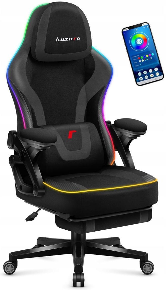 Cechy szczególne Fotel gamingowy z podnóżkiem i oświetleniem RGB LED Oświetlenie sterowane za pomocą aplikacji i pilota Różnorodne kolory i efekty świetlne Ledy migające w rytm muzyki Wysuwany podnóżek Miękkie podłokietniki Zagłówek regulowany góra-dół 2 zintegrowane poduszki: lędźwiowa oraz pod kark Łatwy w pielęgnacji, odporny na uszkodzenia materiał Pochylane oparcie z funkcją bujania Zasilanie USB z komputera lub własnego powerbanku Wiele efektów świetlnych Fotel gamingowy Force 4.6 oferuje bogactwo efektów świetlnych w wielu kolorach, a także umożliwia dostosowanie prędkości i czasu świecenia, zapewniając ciągłe zaskoczenie i niezapomniane wrażenia. Dzięki temu nigdy nie będziesz się nudzić! W rytm Twojej muzyki Oświetlenie RGB LED reaguje na dźwięk muzyki, dynamicznie przystosowując efekty do rytmu i tonów. Synchronizacja światła z ulubionym utworem doda ekscytujący element do Twojej rozgrywki. Sterowanie za pomocą smartfona lub pilota Wystarczy telefon z połączeniem Bluetooth, aby wygodnie sterować LEDami za pomocą intuicyjnej aplikacji. Oświetlenie możesz zmieniać również używając dołączonego pilota. Wsparcie dla kręgosłupa Specjalnie profilowane poduszki zapewniają wsparcie istotnych dla zdrowia obszarów pleców, takich jak dolna część kręgosłupa oraz odcinek szyjny. To sprawia, że łatwiej utrzymasz właściwą postawę podczas długotrwałego siedzenia. Regulowany zagłówek Regulacja zagłówka w zakresie góra-dół gwarantuje komfortowe podparcie dla mięśni szyi, niezależnie od Twojego wzrostu. Oparcie z możliwością bujania Delikatne kołysanie się podczas siedzenia relaksuje, a dodatkowo poprawia krążenie krwi i niweluje napięcie nóg. Pochylane oparcie fotela Dzięki umieszczonej pod fotelem dźwigni możesz łatwo pochylić oparcie, aby dostosować je do swoich potrzeb. Wysuwany podnóżek Dzięki wysuwanemu podnóżkowi w każdej chwili możesz pozwolić sobie na relaks – rozprostuj nogi i spędź przerwę w pracy w sposób maksymalnie przyjemny. Korzystanie z podnóżka zmniejsza nacisk na dolną część pleców i redukuje dyskomfort podczas długotrwałego siedzenia. Specyfikacja Producent: Huzaro Model: Force 4.6 Black RGB Materiały: Tkanina XTwill, PU Carbon Konstrukcja: Stalowa Akcesoria: Poduszka karku, poduszka lędźwiowa Mechanizm: SoftFlex (umożliwia bujanie), SideRest (umożliwia przechylenie oparcia) Siłownik: Gazowy, 3 klasy BIFMA Maksymalne obciążenie: 130 kg