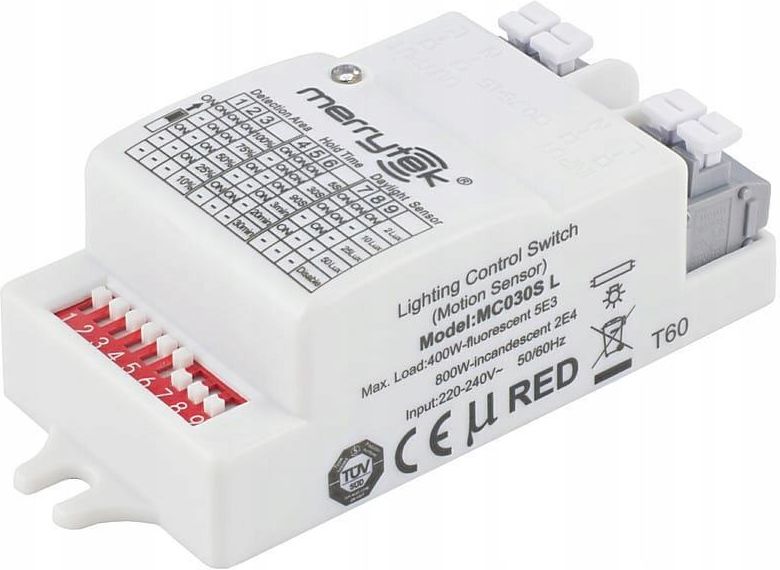 MC030S-L to idealne rozwiązanie dla osób, które chcą mieć kontrolę nad oświetleniem w swoim pomieszczeniu. Dzięki wysyłaniu fal elektromagnetycznych o wysokiej częstotliwości, czujnik reaguje na najmniejszy ruch w wybranej strefie, co pozwala na automatyczne włączanie światła. Co ciekawe, czujnik ten jest w stanie wykryć ruch nawet przez drzwi, szklane wystawy czy cienkie ściany. Dodatkowo, parametry czujnika można łatwo dostosować do indywidualnych potrzeb za pomocą przełączników DIP. Produkt ten posiada wiele certyfikatów, takich jak TUV, CE czy RED, co świadczy o jego wysokiej jakości i bezpieczeństwie użytkowania. GŁÓWNE ZALETY: łatwy w użytkowaniu i instalacji wysoka trwałość urządzenie posiada kompaktowe wymiary, dzięki czemu można je zamontować praktycznie w każdym miejscu. konstrukcja terminala umożliwia łatwe i szybkie podłączenie PARAMETRY: Napięcie: 220-240V, 50Hz Obciążenie znamionowe: 400W (indukcyjny), 800W (rezystancyjny) System HF: 5,8 GHz ± 75 MHz, pasmo fal ISM Pobór energii w stanie spoczynku: < 0,5W Zasięg czujnika: max. (śr. x wys.) 12m x 6m Zakres detekcji: 10% / 25% / 50% / 75% / 100% Czas wyłączenia: 5s / 30s / 90s / 3min / 20min / 30min Czujnik jasności: 2 lux / 10 lux / 25 lux / 50 lux / wyłączone Detekcja ruchu: 0,5 ~ 3 m / s Kąt wykrywania: 150º (na ścianie), 360º (na suficie) Temperatura pracy: -35℃ ~ 70℃ Stopień ochrony: IP20 Wymiary urządzenia: 77 /36 /25,58 mm (długość/szerokość/wysokość) Ustawienia czujnika: Aby dopasować ustawienia mikrofalowego czujnika ruchu do swoich potrzeb, należy skorzystać z 9-segmentowego przełącznika. Pierwsze trzy segmenty(1,2,3) pozwalają na ustawienie zasięgu czujnika, co jest bardzo ważne, gdyż pozwala na uniknięcie fałszywych wykryć ruchu. Kolejne trzy segmenty (4,5,6) służą do ustawienia czasu po jakim czujnik wyłączy światło, co również wpływa na oszczędność energii. Ostatnie trzy segmenty (7,8,9) odpowiadają za próg natężenia światła dziennego, czyli ustawienie poziomu oświetlenia, przy którym czujnik zacznie działać. Przedstawiona poniżej tabela opisuje jak w prosty sposób dostosować czujnik ruchu do własnych potrzeb.