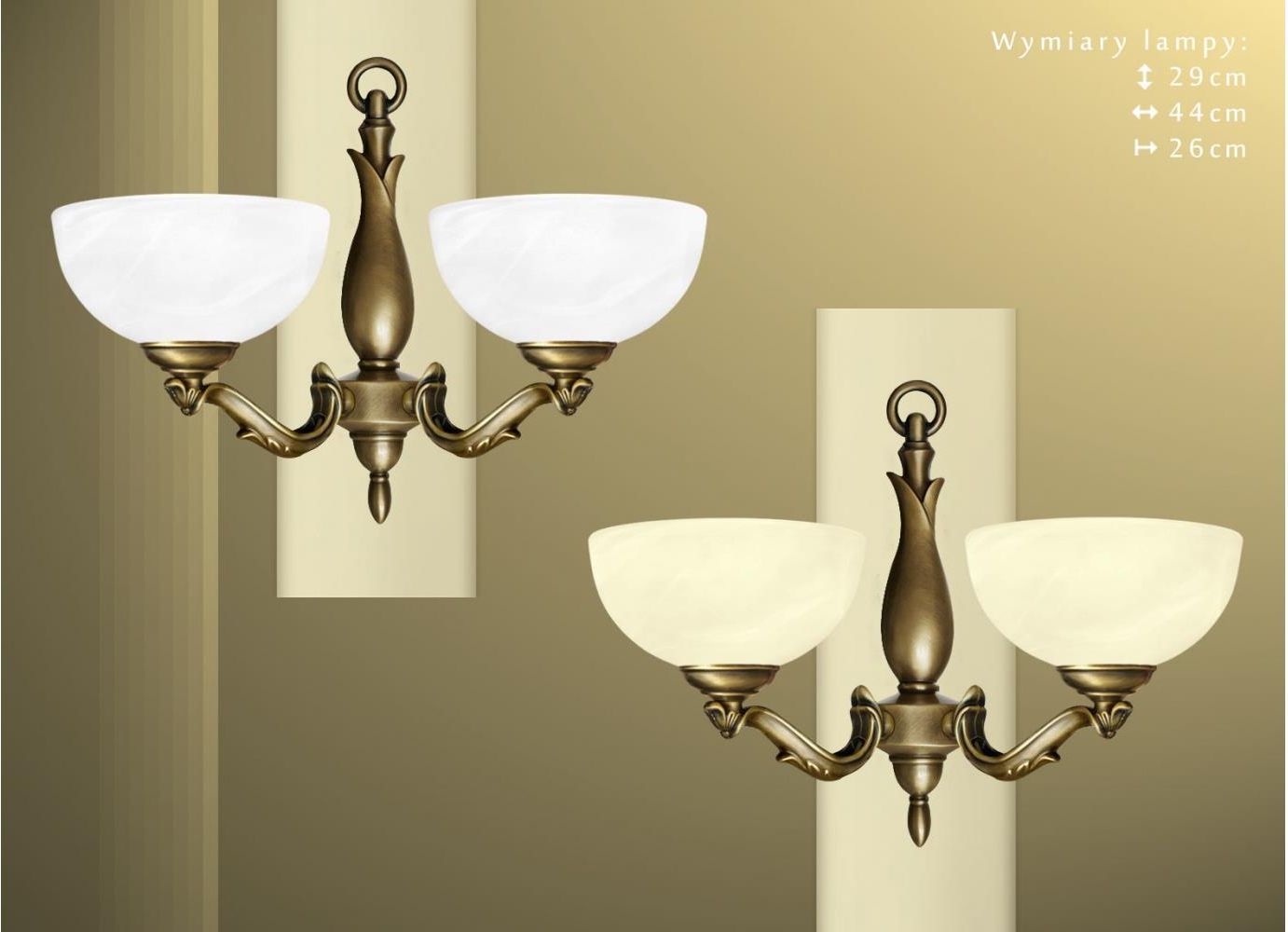 Kinkiet z mosiądzu z dwoma kloszami. - Wykonany w całości z elementów z pełnego mosiądzu. Mosiądz to trwały, szlachetny i ponadczasowy materiał - kliknij, aby dowiedzieć się więcej. - Wykończenie mosiądzu: złota patyna. - Zawiera odlewy mosiężne importowane z Włoch. - Klosz szklany do wyboru: biały ‘alabaster’ lub ecru ‘alabaster’ (albo na zamówienie ecru gładki w zależności od dostępności). - Wymiary całkowite: wysokość 29cm, szerokość 44cm, głębokość 26cm. - Możliwość zainstalowania włącznika łańcuszkowego (bez dopłaty), opis na dole strony:http://www.mninteriors.pl/lampy-na-zamowienie - Żródło światła: 2xE27 (żarówki tradycyjne/żarowe o mocy max. 60W) lub żarówki energooszczędne albo LED o większej mocy (np. odpowiednik 100W). Lampa jest fabrycznie nowa, wyprodukowana w Polsce. Gwarancja: 24 miesiące. Seria M - zobacz wszystkie lampy