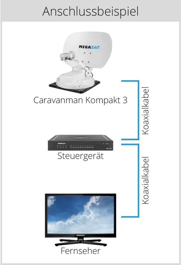Automatyczna antena Megasat Caravanman Kompakt 3 Antena satelitarna Megasat Caravanman Kompakt 3 to w pełni automatyczny system o niskiej wysokości montażowej, odpowiedni do przyczep kempingowych i kamperów. Dzięki niewielkim rozmiarom anteny, wysokości zaledwie 17 cm i powierzchni obrotu wynoszącej tylko 77 cm, antena ta znajdzie swoje miejsce w każdym pojeździe. Połącz się z dowolnym smartfonem lub tabletem za pomocą jednostki sterującej kompatybilnej z Bluetooth. Dzięki bezpłatnej aplikacji Megasat dostępnej dla systemów iOS i Android, systemem można wygodnie sterować. Ponadto, przyszłe aktualizacje oprogramowania układowego mogą być dokonywane za pomocą Bluetooth. Caravanman Kompakt 3 jest wstępnie zaprogramowany dla następujących satelitów: Astra 1-4, Hotbird, Thor, Hispasat, Türksat, Eutelsat 5 W, Eutelsat 9 B. Satelitę można zainstalować na podstawie Mobil-Kit, co pozwala na bardziej elastyczne użytkowanie. Słowniczek terminów ważnych przy wyborze systemu satelitarnego. Najważniejsze cechy Megasat Caravanman Kompakt 3: W pełni automatyczny system. Kompaktowe wymiary i wysokość zaledwie 17 cm. Kompatybilny z Bluetooth. Aplikacja Smart Megasat umożliwia łatwe sterowanie. Kąt wyszukiwania 360°. Wstępnie zainstalowanych 7 satelitów. Możliwość instalacji na podstawie Mobile-Kit. Parametry anteny satelitarnej Megasat Caravanman Kompakt 3: odbiór: DVB-S/S2 kolor: biały wzniesienie (wysokość): 15° - 62° napięcie zasilania: 12 V konwerter: pojedynczy / podwójny zaprogramowane satelity: Astra 1, Astra 2, Astra 3, Astra 4, Eutelsat 5 W, Eutelsat 9B, Hispasat, Hotbird, Thor, Türksat wymiary odbiornika: 19,5 x 3 x 15 cm wymiary anteny (szer. x wys.): 46 x 32 cm zakres wyszukiwania: 360 czas wyszukiwania: ok. 1 - 2 min szerokość: 46 cm wysokość: 17 cm głębokość: 46 cm waga: 5,1 kg wymiary opakowania: 55 x 55 x 21 cm Zawartość opakowania: jednostka zewnętrzna jednostka sterująca kabel koncentryczny 10 m kabel koncentryczny do podłączenia do telewizora 1 m przepust dachowy