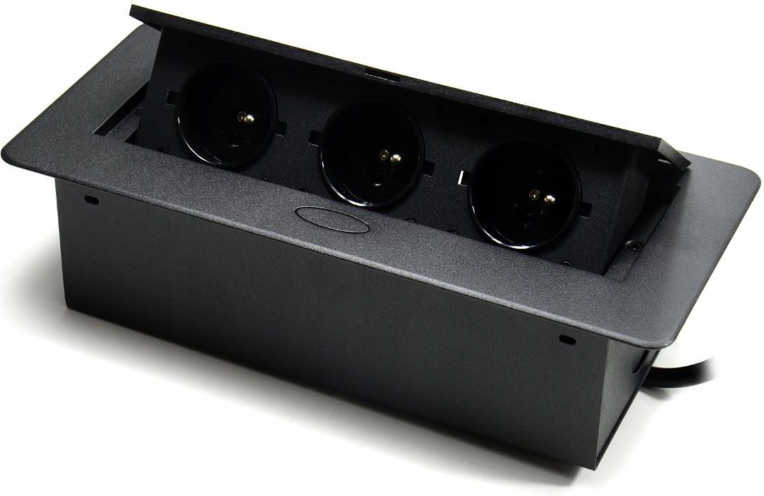Gniazdo Nablatowe Chowane w Blat Kuchenny Potrójne Wpuszczane 3X 230V 1,5m Zalety gniazda blatowego Spacetronik 3 gniazda 110-250V (typ French) wykonane z aluminium i wysokiej jakości komponentów płynne otwieranie za pomocą przycisku idealny do biurek, blatów i stołów możliwość montażu w pozycji poziomej i pionowej 150cm: długość kabla Elegancki i nowoczesny design Seria mediaportów ERGOLINE wyróżnia się niebalanym designem, który sprosta potrzebom nawet tych najbardziej wymagających użytkowników. Wykonany z dbałością o każdy detal, mediaport idealnie wkomponuje się w stanowisko pracy, wnętrze salonu sprzedaży, bądź salę konferencyjną. Łatwa instalacja Montaż gniazda blatowego otwieranego jest bardzo łatwy. Naciśnij przycisk, aby otworzyć mediaport. Odkręć 2 śrubki po bokach na górze mediaportu. Ściągnij górny panel. Sprawdź połączenia. Wytnij otwór o odpowiednich wymiarach. Umieść mediaport w otworze i przykręć go. Specyfikacja Długość kabla: 1,5 m Zasilanie sieciowe: 230 V 50 Hz 3x gniazdo typu francuskiego 110-250 V (16 A) Wymiary puszki (szer./wys./gł.): 22,2 x 10,8 x 6,7 cm Wymiary zewnętrzne: 26,4 x 11,7 cm Wymiary otworu: 224 x 109 mm Gniazdo 230V: 3 Kolor: Czarny Rodzaj gniazd/-a 230V: French (francuskie)
