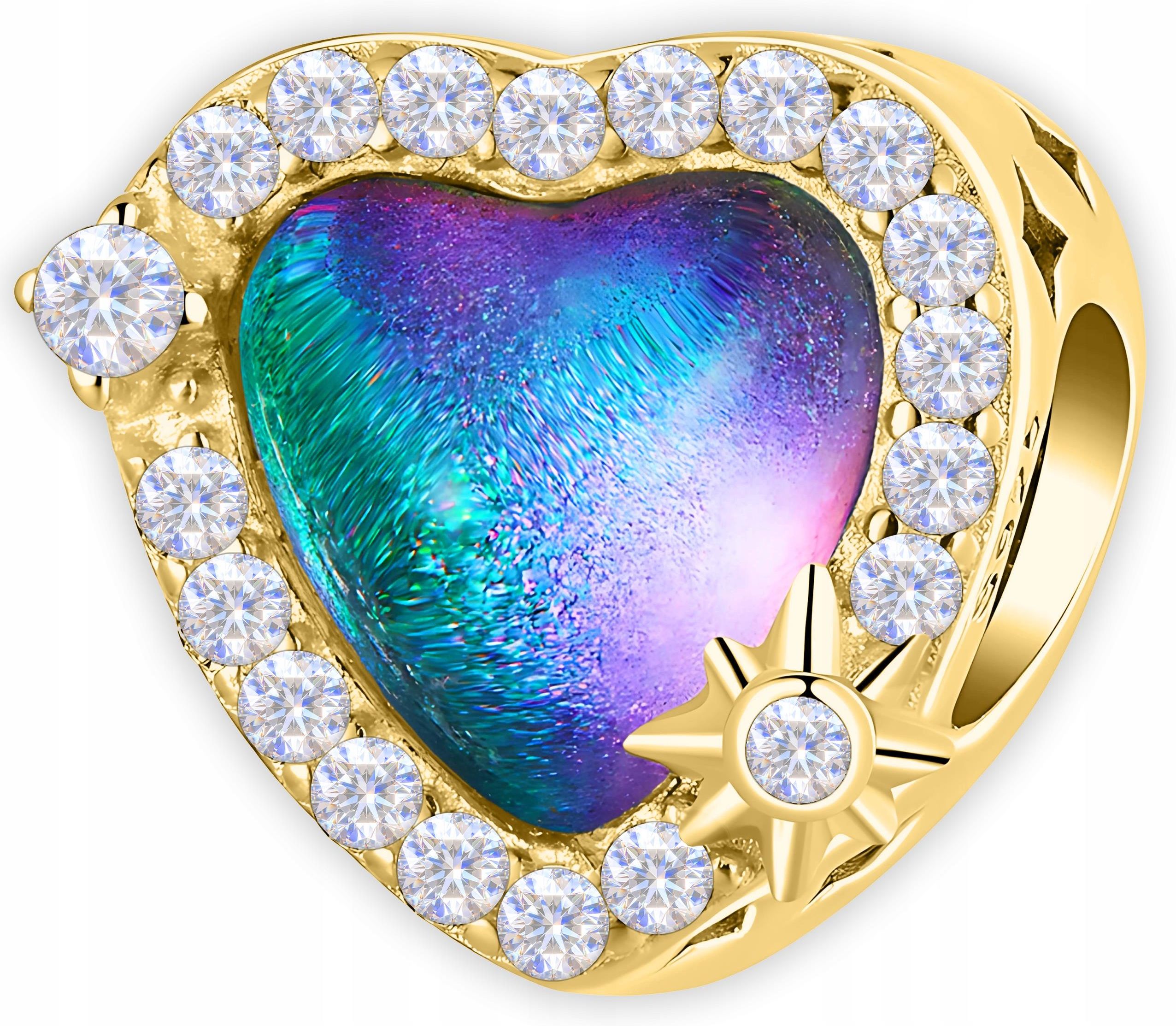 Charms Kolorowe Serce Rodzaj: Zawieszka do bransoletek (CHARMS) Surowiec: Srebro Próba: 925 Pokrycie: Złoto 585 Kamienie: Cyrkonie Wymiary Wysokość: 11,5 mm Szerokość: 11,5 mm Grubość: 10,0 mm Średnica otworu: 4,5 mm Waga: ~ 2,2g Serce w zależności od perspektywy mieni się fioletowy i zielony …