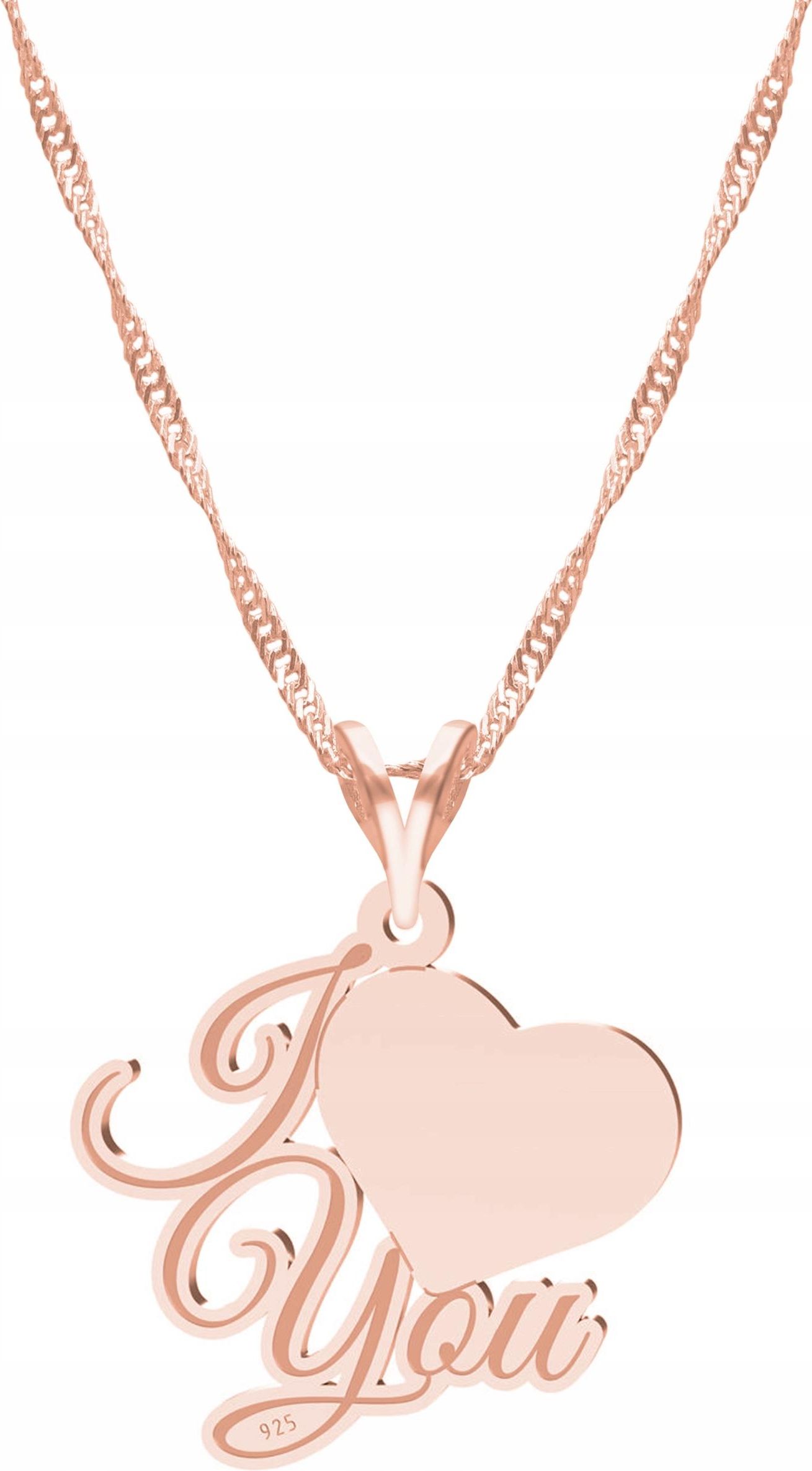 Naszyjnik I Love You różowe złoto 💙 Surowiec: Srebro 💙 Próba: 925 💙 Powłoka:4-warstwy różowego złota próby 750 (18 Karatów) 💙 Kamień: Brak 💙 Typ: Naszyjnik 💙 Długość: 42cm + 3cm (przedłużka w kształcie serc) 💙 Splot łańcuszka: Singapur 💙 Wysokość zawieszki: 19mm 💙 Motyw: Serce 💎 Biżuteria …