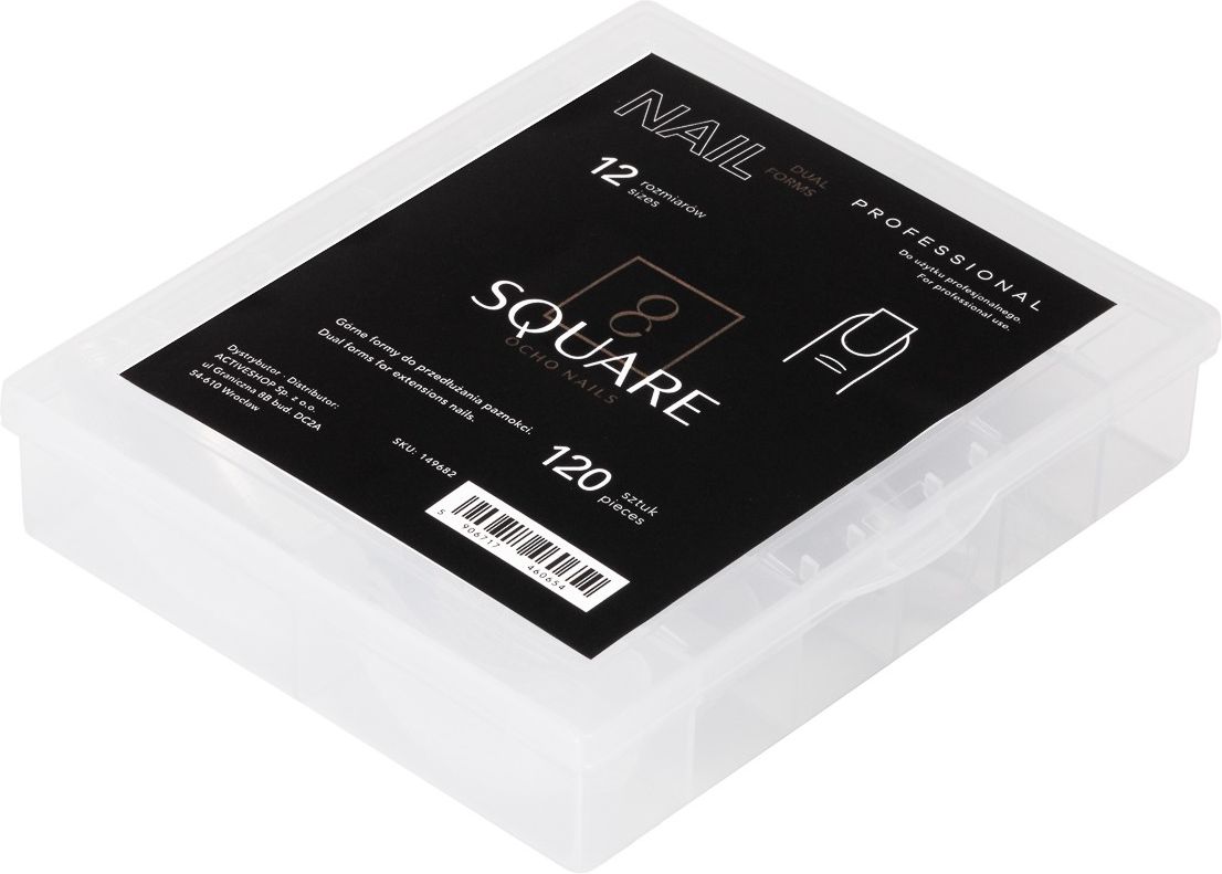 OCHO NAILS to wyjątkowa marka skupiająca się na profesjonalnych produktach dla stylistek paznokci. W jej asortymencie znajdują się lakiery hybrydowe, żele, specjalistyczne lampy oraz akcesoria do pielęgnacji paznokci. Produkty OCHO NAILS spełnią wymagania doświadczonych użytkowniczek, jak i tych, które dopiero rozpoczynają swoją przygodę z manicurem. Idealne akcesorium do przedłużania paznokci Przezroczyste górne formy square do przedłużania paznokci marki Ocho Nails to nowoczesna alternatywa dla tradycyjnych szablonów. Pozwalają szybko i precyzyjnie uzyskać kształt typu kwadrat, nadając paznokciom symetrię i perfekcyjny wygląd. To doskonałe rozwiązanie zarówno dla doświadczonych stylistek, jak i osób rozpoczynających swoją przygodę ze stylizacją paznokci. Dlaczego warto wybrać dual formy Ocho Nails? Górne formy w kształcie kwadrata wyróżniają się wyjątkową elastycznością i trwałością, co pozwala na komfortową pracę bez obaw o ich uszkodzenie. Pomocnicze linie ułatwiają nadanie paznokciom wybranej długości, a przezroczysty materiał zapewnia skuteczne utwardzanie w lampie UV/LED. 12 rozmiarów pozwala na idealne dopasowanie formy do naturalnej płytki, co ułatwia uzyskanie perfekcyjnego efektu. W opakowaniu znajduje się 120 sztuk w 12 różnych wielkościach. Sposób użycia 1. Przed rozpoczęciem zabiegu należy dokładnie zdezynfekować dłonie swoje oraz klientki przy użyciu płynu antyseptycznego i odpowiednio przygotować miejsce pracy. 2. Za pomocą pilnika o odpowiedniej gradacji nadać paznokciom wybrany kształt, delikatnie zmatowić płytkę blokiem polerskim, w razie potrzeby opracować skórki. 3. Nałożyć żel lub akrylożel na wklęsłą część formy. 4. Docisnąć formę do paznokcia, dbając o jej prawidłowe ułożenie. 5. Utwardzić w lampie UV/LED, dostosowując czas do użytego produktu. 6. Ostrożnie zdjąć formę, opiłować paznokieć i wykończyć stylizację wybranym lakierem hybrydowym lub topem.