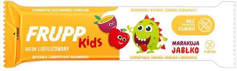 BATON DLA DZIECI LIOFILIZOWANY JABŁKO - MARAKUJA BEZGLUTENOWY 9 g - CELIKO (FRUPP KIDS)CELIKO (batony, galaretki, mieszanki do wypieków)SKŁADNIKI jabłka (29 %), zagęszczone soki i ekstrakty owocowe (ekstrakt z owoców drzewa karobowego, ekstrakt jabłkowy, zagęszczony sok z marakui (6,5 %), zagęszczony sok jabłkowy); fruktooligosacharydy (A)* i/lub inulina (B)*, maltodekstryna, substancja żelująca: pektyny. (*Obecność składnika A, B – patrz przy numerze partii) OPIS Baton FRUPP Kids jabłko - marakuja stworzyliśmy z myślą o najmłodszych konsumentach. To produkt BEZ DODATKU CUKRU! Zawiera naturalnie występujące cukry. Ma wysoką zawartość błonnika (27 %)! Nie ma dodatku tłuszczu i soli! Po prostu pyszna, owocowa przekąska dla dzieci! WARTOŚĆ ODŻYWCZA W 100 g Wartość energetyczna: 1397 kJ/332 kcal Tłuszcz: 0,2 g w tym kwasy tłuszczowe nasycone: 0 g Węglowodany: 68 g w tym cukry: 51 g Błonnik: 27 g Białko: 0,9 g Sól: 0,02 g Zawartość soli wynika wyłącznie z obecności naturalnie występującego sodu. INFORMACJA ALERGENNA Produkt może zawierać dwutlenek siarki. ZALECANE WARUNKI PRZECHOWYWANIA Przechowywać w suchym i chłodnym miejscu. Spożyć bezpośrednio po otwarciu. Producent:CELIKO (batony, galaretki, mieszanki do wypieków)