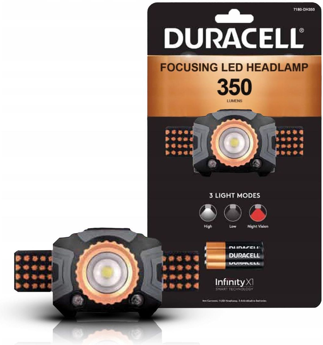 Latarka czołowa Duracell Focusing LED 350 lm - zoom, 3 tryby, IPX4 Oryginalna latarka czołowa Duracell 350 lm (model 7180-DH350SE). Praktyczne rozwiązanie dla aktywnych i osób szukających solidnego oświetlenia w każdych warunkach. Najważniejsze atuty Silne światło 350 lm i zasięg do 60 m — więcej …