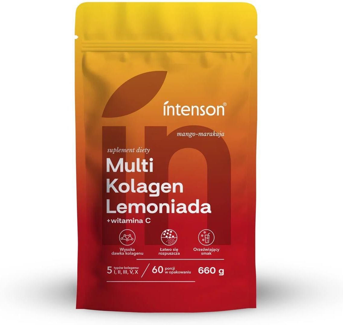 Składniki: 45,5% kompleks kolagenowy (hydrolizat kolagenu wołowego, hydrolizat kolagenu rybiego, niezdenaturowana membrana jaja kurzego, kolagen drobiowy natywny), erytrytol, witamina C (kwas L-askorbinowy), 4% aromaty naturalne (mango, marakuja), regulator kwasowości: kwas cytrynowy; ekstrakt z pestek winogron (Vitis vinifera L.) standaryzowany na 95% proantocyjanidyn, substancja przeciwzbrylająca: dwutlenek krzemu; kwas hialuronowy (hialuronian sodu), substancja słodząca: glikozydy stewiolowe wytwarzane enzymatycznie; witamina A (octan retinylu). (1 porcja) produktu zawiera: Kompleks kolagenowy 5 000 mg Witamina C 500 mg (625%)* Ekstrakt z pestek winogron 100 mg w tym proantocyjanidyny 95 mg Kwas hialuronowy 50 mg Witamina A 400 µg (50%)* *RWS – Referencyjna Wartość Spożycia Masa netto: 660 g Właściwości: Zaawansowany kompleks kolagenowy – połączenie różnych źródeł kolagenu dla uzupełnienia codziennej diety (5 typów kolagenu: I, II, III, V i X). Wzbogacony skład – zawiera kwas hialuronowy, witaminy A i C oraz ekstrakt z pestek winogron (naturalne źródło proantocyjanidyn). 5 g kompleksu kolagenowego w porcji (11 g). Bez dodatku cukru – słodzony glikozydami stewiolowymi. Pyszny, egzotyczny smak – naturalne aromaty mango i marakui. Wygodne stosowanie – proszek szybko rozpuszcza się w wodzie, tworząc smaczny, łatwy do wypicia napój. Duże, ekonomiczne opakowanie (660 g) – zawiera 60 dziennych porcji i wystarcza na ok. 2 miesiące regularnego stosowania. Praktyczne opakowanie strunowe – ułatwia przechowywanie i dłużej zachowuje świeżość produktu. Zalecane dzienne spożycie: Dorośli: 11 g produktu dziennie. Jedną pełną miarkę (11 g) proszku wsyp do kubka i rozpuść w 200 ml letniej wody. Spożywaj raz dziennie. Przeciwwskazania: Nadwrażliwość na którykolwiek ze składników preparatu. W okresie ciąży i karmienia piersią przed zastosowaniem należy skonsultować się z lekarzem lub farmaceutą. Przechowywanie: Przechowywać w suchym miejscu. Producent: INTENSON S.A. ul. Całowanie 94G, 05-480 Karczew