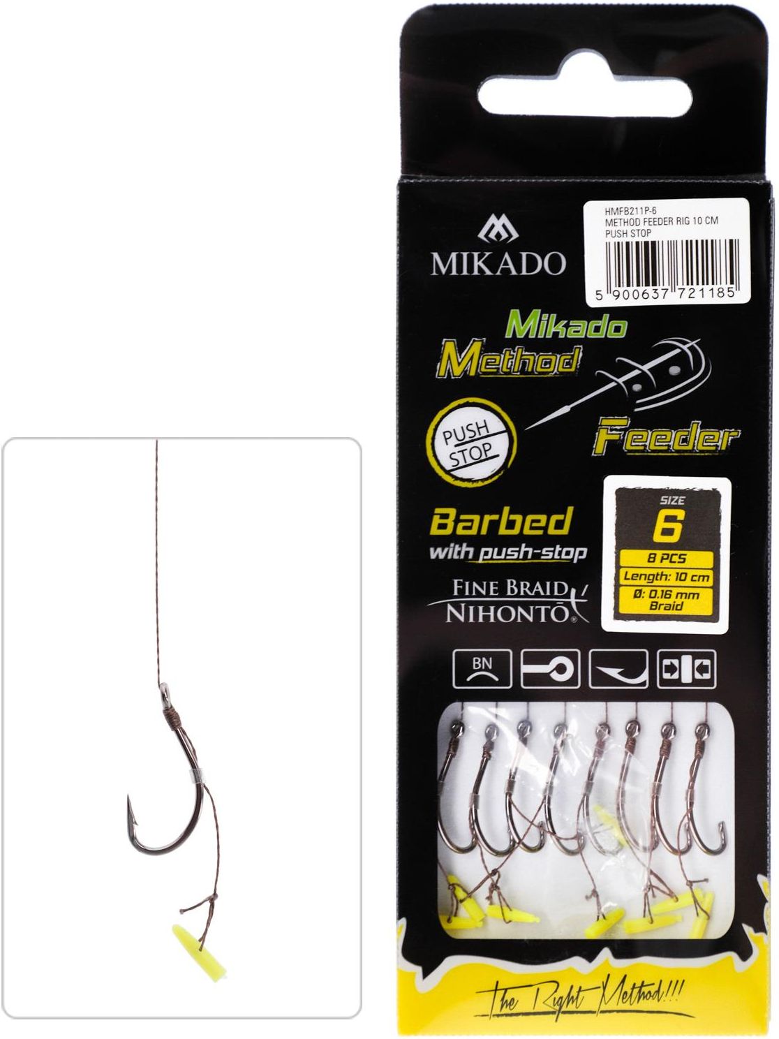 Przedmiotem sprzedaży są przypony do metody firmy Mikado. Model haka - Maruseigo Zakończenie - stoper Push-Stop Długość - 10cm Średnica plecionki - 0,16mm Wielkość haka - 6 Kod produktu - HMFB211P-6 Cena - za opakowanie mieszczące 8szt. Opis ze strony producenta Profesjonalne gotowe przypony do methody zawiązane na wyjątkowo miękkiej i mocnej plecionce Nihonto Fine Braid w maskującym brązowym kolorze. Załączone zdjęcie jest mojego autorstwa i objęte jest prawami autorskimi.