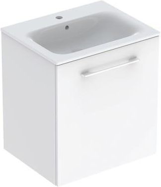 Zestaw umywalki meblowej Geberit Selnova Square, slim, z szafką pod umywalkę, jedne drzwi Zestaw umywalki meblowej Geberit Selnova Sqaure to perfekcyjne połączenie minimalizmu i najwyższej jakości wykonania. Klasyczny, biały kolor zapewnia efekt lekkości i świeżości. Całość doskonale uzupełnia chromowany uchwyt. Dzięki praktycznej szafce przechowasz swoje kosmetyki, przybory i środki czystości. Została wyposażona w mechanizm cichego domykania, dzięki któremu otwieranie i zamykanie szafki jest płynne, bezgłośne i w pełni komfortowe. To rozwiązanie, które spełni wszystkie Twoje oczekiwania! Dane techniczne Materiał Ceramika sanitarna / sprasowana trójwarstwowa płyta wiórowa Charakterystyka Certyfikat FSC™ C134279 Wiszący Cienki rant Z jednymi drzwiami Z półką zamocowaną na stałe Uchwyt do otwierania Drzwi z mechanizmem cichego domykania Zawias z lewej lub prawej strony Wilgocioodporny Dostarczany wstępnie zmontowany Wymiary B: 60 cm B1: 58,8 cm B2: 52 cm B3: 54 cm Szerokość umywalki: 60 cm H: 65,2 cm T: 50,2 cm