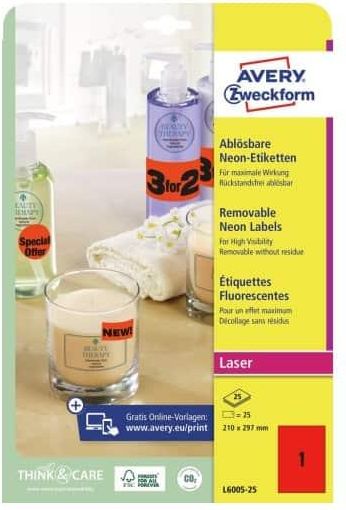 Łatwousuwalne etykiety neonowe w kolorze czerwonym L6005-25 w formacie 210x297mm od AVERY ZWECKFORM, przyciągają uwagę i są idealne do widocznego oznaczania dokumentów i produktów. 25 neonowych etykiet na 25 arkuszach w opakowaniu. Gwarantowany wydruk bez zacięć i bez pozostałości śladów kleju w drukarce. Neonowo-czerwone papierowe etykiety o niezawodnej przyczepności. Usuwalne. Wyraźny obraz bez smug dzięki idealnemu przyleganiu tonera i tuszu Certyfikat FSC®: wierzchni materiał etykiety jest wykonany z papieru pochodzącego z odpowiedzialnie zarządzanych lasów i może być poddany recyklingowi Idealne do różnokolorowego oznaczania Do wszystkich standardowych drukarek laserowych atramentowych — gwarancja braku zacięć Zaprojektuj i wydrukuj swoje etykiety w szybki i łatwy sposób. Aby uzyskać dostęp do bezpłatnych szablonów i oprogramowania Avery Zweckform odwiedź www.avery-zweckform.pl/oprogramowanie. Możesz też skorzystać z szablonów zintegrowanych z Microsoft® Office. Etykiety kolorowe posiadają certyfikat FSC® oraz są odpowiednie do wszystkich standardowych drukarek laserowych, atramentowych i kopiarek.Neutralna dla klimatu firma Avery Zweckform już od 2014 roku korzysta wyłącznie z ekologicznej energii elektrycznej/gazu. Badania, rozwój, produkcja, logistyka i administracja znajdują się w siedzibie firmy w Oberlaindern w Bawarii i gwarantują najwyższe standardy jakości i ochrony środowiska oraz krótkie trasy dostaw. Materiał wierzchni tych bezchlorowo bielonych etykiet jest wykonany w 100% z papieru pochodzącego z lasów zarządzanych w sposób zrównoważony i posiadającego certyfikat FSC®.