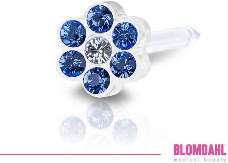 Bezpieczny dla skóry hipoalergiczny kolczyk do przekłuwania uszu Daisy Sapphire/ Crystal 5 mm z ozdobnymi kryształami Swarovski w kształcie kwiatka producenta Blomdahl. Oprawa kryształu jak i sam kolczyk zostały wykonany z plastiku medycznego, który ma na celu zmniejszenie ryzyka wystąpienia reakcji alergicznej. Kolczyk znajduje się w sterylnej kasecie do pistoletu. Średnica części ozdobnej to 5 mm.