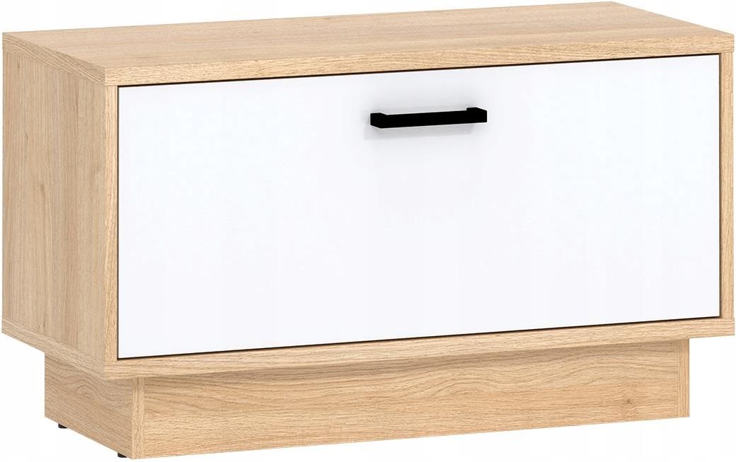 Szafka na buty do przedpokoju dąb biała COLIN CN10 Szafka COLIN CN10 sprawdzi się jako funkcjonalny element do przedpokoju w aranżacji utworzonej wedle własnego pomysłu. Wnętrze można wykorzystać do przechowania obuwia, co pomoże w utrzymaniu porządku w pomieszczeniu. Charakterystyczną cechą COLIN CN10 jest zestawienie korpusu w kolorze dąb nagano z frontem w białym połysku, które sprawią, że wnętrze zyskuje niepowtarzalny styl. Dodatkowo mebel osadzono na solidnych wysokich nóżkach, a poziomy czarny uchwyt doskonale komponuje się z całością bryły. Model CN10 pochodzi z kolekcji COLIN składającej się z 17 segmentów systemu. Mebel pakowany w częściach do samodzielnego montażu, wraz z czytelną instrukcją i akcesoriami montażowymi. ✅ Wymiary: Wysokość: 48,3 cm Szerokość: 83,7 cm Głębokość: 37 cm ✅ Wnętrze: Mebel złożony jest z dwóch drzwiczek, za którymi znajduje się pojemna wnęka, gdzie swobodnie uporządkujesz akcesoria lub buty. W drzwiczkach zastosowano system cichego domyku zintegrowany z zawiasem, co pozwala na delikatne zamykanie i zapobiega trzaskaniu. Takie rozwiązanie nie tylko zwiększa komfort ich użytkowania, ale gwarantuje dłuższą żywotność produktu. ✅ Wykończenie: Model został wykonany z wysokiej jakości płyty laminowanej zapewniającej mu wytrzymałość na czynniki zewnętrzne, bezpieczeństwo oraz odporność na zarysowania i zabrudzenia. Dodatkowym zabezpieczeniem krawędzi jest trwałe obrzeże ABS. Mebel otwierany jest za pomocą wygodnego plastikowego uchwytu. ✅ Wybarwienie: Kolor korpusu: dąb nagano Kolor frontu: biały połysk ✅ Fotografie: