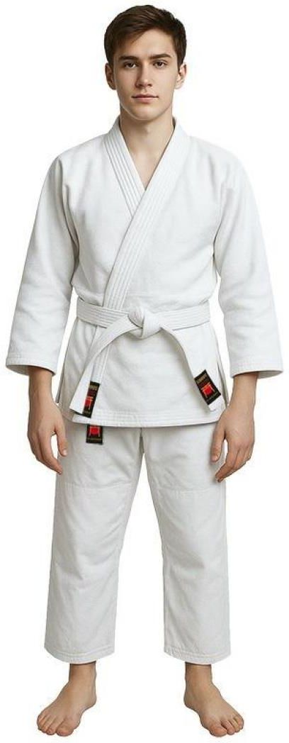 Wysokiej jakości strój do judo z białym pasem Kompletny strój do judo, stworzony z myślą o trwałości i wygodzie podczas treningów. Zestaw obejmuje bluzę, spodnie oraz biały pas, idealny dla osób rozpoczynających swoją przygodę z tym sportem. Bluza Bluza wykonana jest z grubej plecionki o standardowym wykończeniu, z solidnym, wzmocnionym kołnierzem. Materiał jest odporny na ciągnięcia i szarpania, co zwiększa trwałość stroju nawet podczas intensywnych treningów. Spodnie Spodnie posiadają wygodny pas z wszytą gumą i sznurkiem, co ułatwia dopasowanie do sylwetki. Nogawki zostały wzmocnione w okolicach kolan, co chroni przed przetarciami i zapewnia komfort podczas ćwiczeń. Materiał i specyfikacja Bluza: plecionka 48% poliester, 52% bawełna, gramatura 225 g/8 oz Spodnie: gładkie 65% poliester, 35% bawełna, gramatura 170 g/6 oz Komplet: bluza + spodnie + biały pas Kolor: biały Dodatkowe informacje Zaleca się zakup stroju w nieco większym rozmiarze, ponieważ materiał niedekatyzowany może nieznacznie skurczyć się w pierwszym praniu. Informacje o bezpieczeństwie produktu Strój przeznaczony wyłącznie do treningu judo. Należy stosować go zgodnie z zasadami bezpieczeństwa i pod nadzorem trenera w przypadku początkujących.