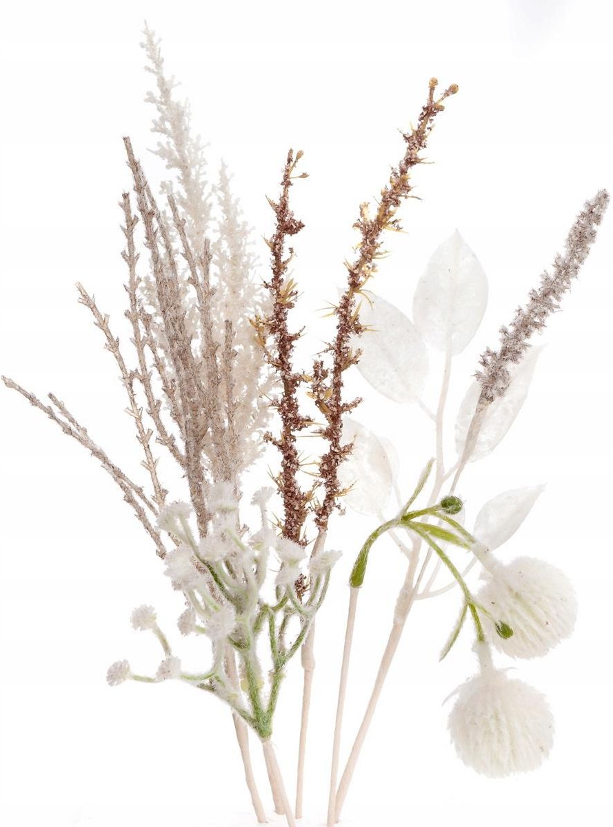 Gałązki boho w bukieciku o naturalnych, neutralnych kolorach to wysokiej jakości, uroczy dodatek florystyczny. Każda z gałązek jest innego rodzaju: od klasycznej z listkami, przez bardziej rozłożyste, aż do zakończonej jasnymi kulkami imitującymi kwiaty. Gałązki są doskonałe do tworzenia rozmaitych, florystycznych projektów home decor np. wieńców, wiszących oraz stojących kwiatowych dekoracji i większych bukietów. Świetne do kwiatowych kopułek czy większych dekoracji w szklanych butelkach lub słoikach. Bukiet gałązek prezentuje się również pięknie włożony klasycznie do wazonika. Gałązki można wykorzystać z powodzeniem jako element produktowych sesji fotograficznych oraz do tworzenia zachwycających zdjęć typu flat lay w stylu rustykalnym lub boho. Liczba gałązek w opakowaniu/bukieciku: 6 szt. Długość gałązek: do 26 cm Kolor: neutralny; odcienie kremów, beżów i łamanej bieli i delikatnej zieleni Cechy szczególne: bardzo realistyczne gałązki wysokiej jakości