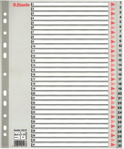 Przekładki w kolorze szarym. Wierzchnia karta z wydzielonymi, dużymi powierzchniami na opisy. format A4+ pozwala na szybki dostęp do dokumentów, nawet w przypadku przechowywania ich w koszulkach wzmocniony perforowany pasek na karcie opisowo-informacyjnej 31 zadrukowanych numerycznie (1-31) …