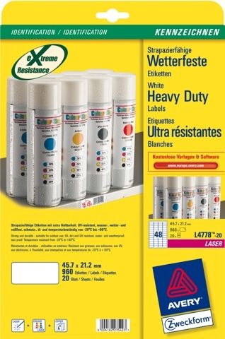 Etykiety Heavy Duty do użytku zewnętrznego bardzo wytrzymałe etykiety z białego poliestru odporne na działanie warunków otoczenia idealne do oznaczania produktów, cen lub przy inwentaryzacji środków trawłych wodoodporne, odporne na działanie smarów, brudu i temperaturę od -20°C do +80°C rodzaj kleju: trwały kolor: biały wymiar: 45,7 x 21,2mm materiał: folia poliestrowa arkuszy w opakowaniu: 20 etykiet na arkuszu: 48 etykiet w opakowaniu: 960 kształt: prostokątny przeznaczone do drukarek laserowych i kolorowych laserowych *Darmowe i łatwe w użyciu szablony oraz oprogramowanie dostępne na stronie www.avery-zweckform.pl