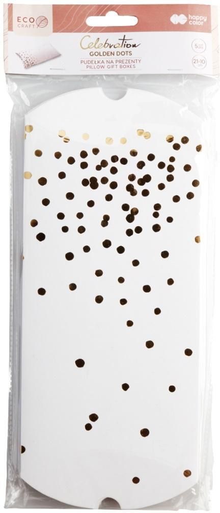 Pudełka na prezenty Golden Dots 21x10cm 5 sztuk Ha Pudełka ozdobne na prezenty z białego kartonu ze złotymi swobodnie rozrzuconymi plamkami. Pakowane w jednym rozmiarze lub zestawach. Wymiary: 21x10 cm Ilość w opak. – 5 szt.