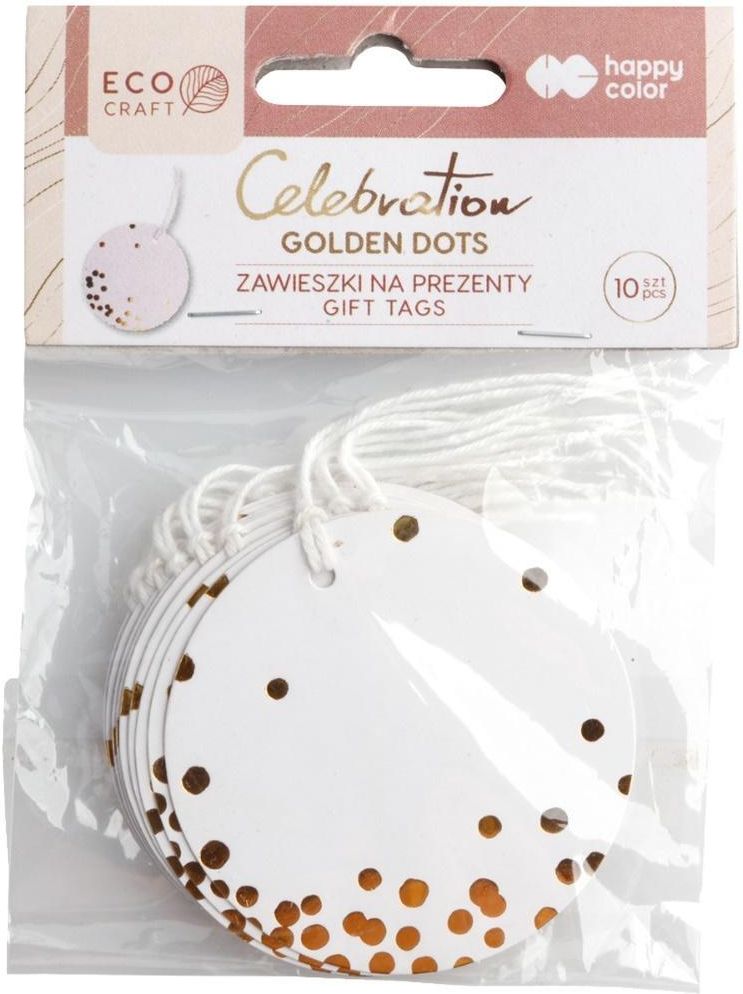 Eleganckie okrągłe zawieszki z białego papieru z wytłoczonymi złotymi plamkami. Możliwość dopisywania dedykacja. Każda zawieszka posiada sznureczek w kolorze białym. * Kształt - okrągły * Wymiar - średnica 6 cm * Sznureczek - biały * Ilość w opakowaniu - 10 sztuk Opakowanie: blister