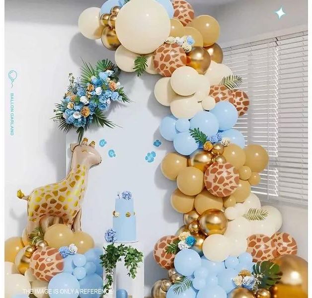 Gotowy zestaw do stworzenia cudownej dekoracji balonowej. Kolorystyka na tej karcie produktu jest związane z motywem Safari Żyrafa. W skład zestawy wchodzą balony lateksowe (gumowe): 15 szt. - 10 cali - balon lateksowy w kolorze niebieskim 10 szt. - 5 cali - balon lateksowy w kolorze niebieskim 1 szt. - 18 cali - balon lateksowy w kolorze ala krem 15 szt. - 10 cali - balon lateksowy w kolorze ala krem 1 szt. - 18 cali - balon lateksowy w kolorze złotym 15 szt. - 10 cali - balon lateksowy w kolorze brązowym 10 szt. - 5 cali - balon lateksowy w kolorze brązowym 10 szt. - 12 cali - balon lateksowy z nadrukiem 1 szt. - balon foliowy w kształcie żyrafy 1 szt. taśma do girland 1 szt. kropki klejowe Zestaw jest do samodzielnego montażu i wykonania. Jeśli potrzebujesz pompkę do balonów lub inne akcesoria zapraszamy do Naszych pozostałych ofert. Liczba widniejąca na opakowaniu nie wlicza dodatków typu (wiązadełka, kleju lub taśmy - u niektórych producentów). My podajemy ogólną wartość ilościową znajdującą się w opakowaniu girlandy. Girlanda balonowa to dekoracja składająca się z balonów, które są przymocowane do siebie za pomocą specjalnej linii lub sznurka ewentualnie taśmy do girland. Zestaw może zawierać różnego rodzaju balony, w różnych kolorach i rozmiarach, oraz akcesoria potrzebne do zawieszenia girlandy. Girlanda balonowa może być używana do dekoracji różnych wydarzeń, takich jak urodziny, wesela, imprezy tematyczne, a także jako ozdoba do pokoju dziecka. Prosty i szybki montaż - girlanda balonowa jest łatwa w montażu i nie wymaga specjalistycznej wiedzy ani narzędzi. Uniwersalność - girlandy balonowe mogą być stosowane na różnego rodzaju wydarzeniach, takich jak urodziny, wesela, imprezy tematyczne. Niski koszt - w porównaniu z innymi rodzajami dekoracji, girlandy balonowe są stosunkowo tanie. Wiele możliwości kreatywnych - girlandy balonowe mogą być tworzone w różnych kształtach, kolorach i rozmiarach, co pozwala na wyrażenie indywidualnego stylu i oryginalności.