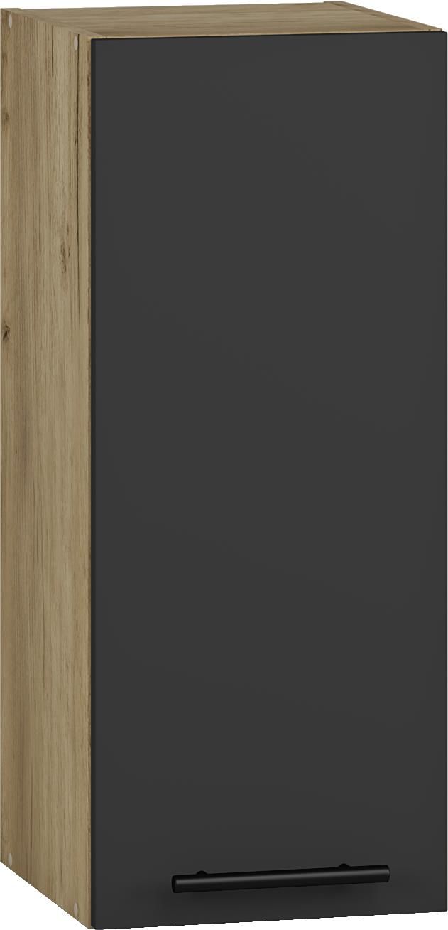 Szafka górna kuchenna wisząca modułowa Dąb Craft Antracyt VENTO G-30/72 Szafka górna VENTO G-30/72 Vento G-30/72 to wisząca jednodrzwiowa szafka kuchenna należąca do modułowego systemu mebli Vento. Wewnątrz znajdują się dwie półki, które zapewnią dodatkową przestrzeń do przechowania. W szafce zastosowano zawiasy z mechanizmem cichego domykania, dzięki czemu drzwiczki nie trzaskają, ale samoczynnie wyhamowują i delikatnie się zamykają. To świetne rozwiązanie dla osób ceniących sobie spokój lub posiadających dzieci. Zamykana szafka górna Vento o szerokości 30 cm świetnie sprawdzi się w nowoczesnej aranżacji kuchni jako praktyczne miejsce służące do wygodnego przechowywania niezbędnych akcesoriów kuchennych, produktów suchych i przypraw. Cechy produktu front – płyta MDF 16 mm / antracyt korpus – płyta laminowana 16 mm / dąb craft cichy domyk uchwyt chromowany zawieszki z regulacją trzy zamknięte wnęki samodzielny montaż Wymiary Szerokość: 30 cm Wysokość: 72 cm Głębokość: 30 cm Waga: 11.4 kg Wykończenie Front został wykonany z płyty MDF pokrytej laminatem o matowej powierzchni w kolorze antracytowym, który jest najciemniejszym odcieniem szarości wpadającym lekko w czerń. Korpus wykonano z laminowanej płyty wiórowej w ciepłym i łagodnym kolorze dąb craft z widocznym naturalnym rysunkiem słojów oraz sęków. Grubość płyty MDF oraz płyty laminowanej wynosi 16 mm. Chromowany uchwyt o długości 128 mm ułatwi wykonywanie codziennych obowiązków. Użyte materiały są łatwe w utrzymaniu czystości oraz odporne na uszkodzenia mechaniczne, co gwarantuje wysoką jakość produktu i jego bezpieczne użytkowanie przez lata. Mebel wyposażono w wytrzymałe zawieszki pozwalające na precyzyjne wyregulowanie pozycji, co pomoże w utworzeniu jednolitej i harmonijnej całości wszystkich szafek górnych. System VENTO Wybierając meble systemowe Vento – z łatwością stworzysz idealnie dopasowaną do indywidualnych potrzeb kuchnię w nowoczesnym stylu. System oferuje kilkadziesiąt szafek kuchennych – górnych, dolnych, zlewozmywakowych, pod piekarnik itp. dostępnych w różnych rozmiarach i wariantach kolorystycznych, które można razem zestawić i skomponować wymarzony zestaw kuchenny. Dzięki eleganckim meblom modułowym Vento zaprojektujesz ponadczasową kuchnię samodzielnie. Wystarczy, że dokładnie zmierzysz przestrzeń, wybierzesz ulubione szafki, które pasują wymiarami do Twojego projektu i gotowe! Nieograniczone możliwości wyboru elementów sprawiają, że każda kuchnia z pewnością będzie niepowtarzalna. Przykładowe zestawienia Dostępne warianty mebli modułowych VENTO