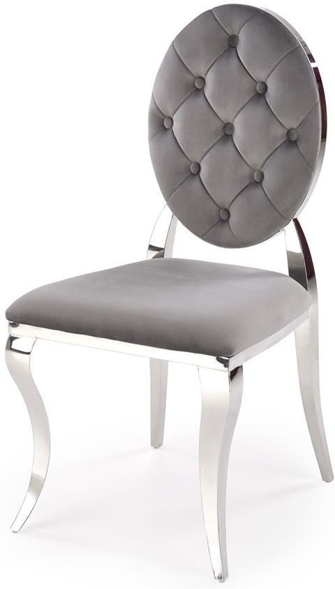 Krzesło Tapicerowane Welurowe Popielate Srebrne Nogi K555 do Salonu Glamour Krzesło K555 posiada komfortowe oparcie i siedzisko w kolorze popielatym, który nadaje meblowi wyjątkowego wyglądu. Model tapicerowany jest miękką i przyjemną w dotyku tkaniną welurową (BLUVEL#14). Tego typu materiał …