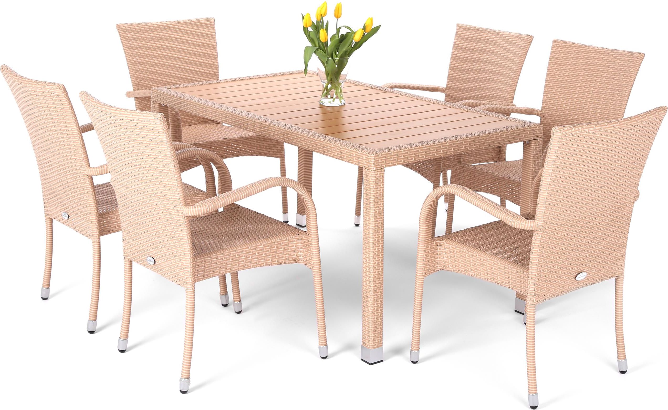 Zestaw foteli ogrodowych Mori 6+1 skład zestawu: stół prostokątny, 6 krzeseł stół: beż krzesła: beż meble do ogrodu, na taras lub balkon odporne na promienie UV, wiatr, deszcz, śnieg, mróz wykończenie przypominające technorattan na krzesłach blat desek kompozytowych Gwarancja 24 miesiące Zestaw ten to komplet dla 6 osób. 6 foteli oraz stół stanowią idealne połączenie wygody i użyteczności. Meble dobrane są pod względem stylu, koloru oraz wielkości. Idealnie nadaje się do ogrodu, tarasu czy ogródka kawiarni. Mori to pełny elegancji komplet starannie wykończonych mebli z technorattanu. Meble charakteryzują się wysoką jakością wykonania: konstrukcję krzeseł i stołu wykonano z malowanych proszkowo grubych profili aluminiowych, a pokrycie z wytrzymałego i odpornego na niekorzystne warunki atmosferyczne technorattanu. Bardzo charakterystyczny dla tego zestawu jest blat stołu, który stanowią deski kompozytowe WPC - odporne na wilgoć, zanieczyszczenia i promienie UV. Meble bardzo dobrze sprawdzą się na zewnątrz (ogród, taras, balkon) jak i we wnętrzu domu, kawiarni czy też restauracji. Delikatnie wygięte krzesła prezentują się bardzo elegancko. Staranne wykończenie mebli oraz aluminiowe końcówki nóżek przy krzesłach i stole nadają im ekskluzywnego charakteru. Zestaw nie zawiera poduszek!