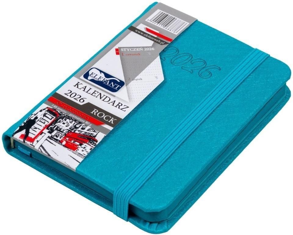 Kalendarz 2026 A7 tygodniowy Rock, turkusowy Kalendarz wykonany jest z trwałych materiałów. Szczegóły: • zamykany na gumkę w kolorze okładki, • gumka na długopis w kolorze okładki, • brzegi kalendarza z kolekcji Rock są w kolorze okładki, • zaokrąglone narożniki opraw i stron, • tasiemka w kolorze okładki, • koperta na odwrocie oprawy w kolorze okładki, • układ: tygodniowy – przejrzysty i jasny rozkład kalendarza Rock, • wewnątrz: plan roku i rozkład roku 2025, terminy ferii zimowych, święta oficjalne i zwyczajowe, notes, skorowidz teleadresowy, kalendarium dodatkowe na 2024-2025-2026 rok. Kalendarz wykonany jest z trwałych materiałów. Szczegóły: • zamykany na gumkę w kolorze okładki, • gumka na długopis w kolorze okładki, • brzegi kalendarza z kolekcji Rock są w kolorze okładki, • zaokrąglone narożniki opraw i stron, • tasiemka w kolorze okładki, • koperta na odwrocie oprawy w kolorze okładki, • układ: tygodniowy – przejrzysty i jasny rozkład kalendarza Rock, • wewnątrz: plan roku i rozkład roku 2025, terminy ferii zimowych, święta oficjalne i zwyczajowe, notes, skorowidz teleadresowy, kalendarium dodatkowe na 2024-2025-2026 rok.