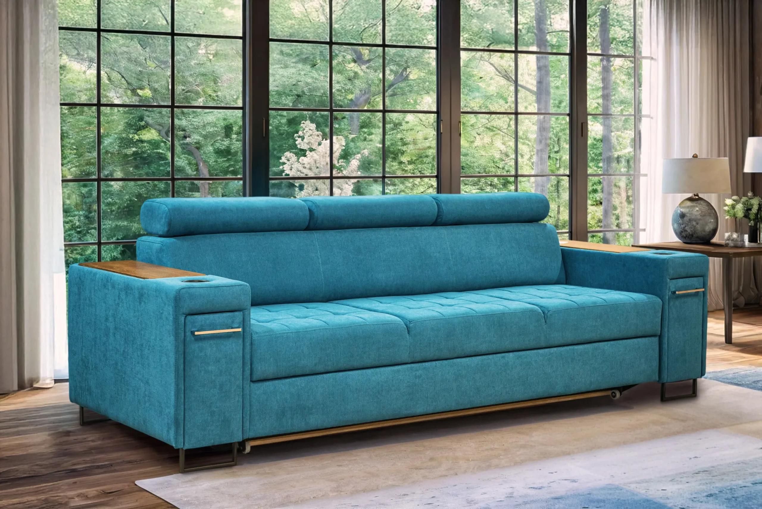 Kanapa rozkładana, kanapa 3 osobowa Charlie I z barkiem i powerport funkcja spania regulowane zagłówki funkcjonalne boczki z drewnianymi półeczkami i uchwytami na kubek listwa zasilająca powerport 2 x barek pikowane siedzisko solidne nóżki ZDJĘCIE PRZEDSTAWIA REALNY WYGLĄD PRODUKTU. NIE JEST WIZUALIZACJĄ KOMPUTEROWĄ. Kanapa Charlie I to propozycja dla osób szukających nie tylko pięknego wyglądu, ale także funkcjonalności.Projekt tego modelu zakłada maksymalne wykorzystanie potencjału, którego efektem jest szereg funkcji, a mianowicie: regulowane zagłówki, miejsca na kubki, dwa barki, drewniane półki na oparciach oraz listwa zasilająca Powerport, która po złożeniu staje się wykończeniem podłokietnika. Sofę cechuje oszczędność ozdobników, za wyjątkiem zastosowanych na siedziskach, pięknych przeszyć w kostkę. Ponadto kanapa posiada wygodną funkcję spania o wymiarach 125×195 cm.Oryginalny design i funkcjonalnośćStaranne wykonanie oraz zastosowanie materiałów najwyższej jakości gwarantuje wieloletnią satysfakcję z użytkowania. Siedziska wykonane są w systemie sprężyn falistych typu B pokrytych wysoko elastyczną pianką tapicerską. Większość firm zamiast tego oferuje płytę meblową i piankę, nie stosując sprężyn, co w rezultacie sprawia, że takie miejsce nie nadaje się do codziennego spania.Wymiary: Szerokość: 240 cm Głębokość całkowita: 100 cm Głębokość siedziska: 58 cm Wysokość ze złożonymi zagłówkami: 85 cm Wysokość z rozłożonymi zagłówkami: 103 cm powierzchnia spania: 125 x 190 cm Cena dotyczy tkaniny w wersji PREMIUM. Istnieje możliwość wykonania w materiałach plamoodpornych, ekoskóach lub skórach naturalnych.Realizuję również meble na indywidualne zamówienie (wymiary, strony, szycia, wzory, układy, wybarwienia listew wykończeniowych itp.). Posiadamy szeroki wybór tkanin w trzech wersjach cenowych: Tkaniny z grupy I – podstawowej Tkaniny z grupy II – z dopłata 10% od ceny podstawowej Tkaniny PREMIUM – z dopłatą 25 % od ceny podstawowej Dysponujemy tkaninami plamoodpornymi łatwo czyszczącymi firmy Fargotex i wielu innych producentów. SZEROKI WYBÓR TKANIN I KOLORÓW WYBARWIENIA DREWNA, ZNAJDUJĄ SIĘ NA STRONACH PONIŻEJ: TKANINY OBICIOWEWYBARWIENIA DREWNAPracujemy wyłącznie na sprawdzonych produktach polskich i zagranicznych producentów (nie korzystamy z wschodnich podróbek).Naszym priorytetem jest dokonanie wszelkich starań, aby Nasi klienci byli zadowoleni.Meble wykonane są z wysokiej jakości polskich materiałów.Aby uzyskać więcej informacji, proszę o kontakt z naszymi sprzedawcami: Tel: 788 509 803Tel: 661 442 118 Istnieje możliwość obejrzenia oferowanych przez naszą firmę mebli przez 6 dni w tygodniu. Od poniedziałku do piątku w godzinach 8:00-17:00 oraz w sobotę od godziny 8:00 do 12:00 w siedzibie naszej firmy.UWAGA! WNOSZENIE TOWARU W ZAKRESIE KLIENTA! MEBLE MIESZCZĄ SIĘ W DRZWIACH 80 CM.Czas realizacji zamówienia od 3 do 5 tygodni. Możliwy szybszy czas realizacji, jeśli dany model znajduje się na stanie magazynowym.