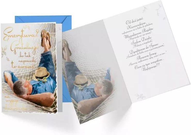 Kartka na Urodziny - Passion Premium z nadrukiem "Gratulacje z okazji przejścia na emeryturę, dla mężczyzny" o wymiarach B6 (16,6 cm x 11,7 cm po złożeniu). Kartki z serii Passion Premium to świetny pomysł na piękną pamiątkę, każda kartka jest zdobiona przynajmniej dwoma rodzajami uszlachetnień - metaliczne lub perłowe folie, brokat, tłoczenie itp. - tyle piękna w takim drobiazgu (uzależnione od rodzaju kartki)! Każda kartka Passion Premium ma kolorowe wnętrze z tekstem wyjątkowych życzeń i grafiką, w komplecie jest także dopasowana kolorystycznie koperta. Karnety, znane również jako kartki, to uniwersalny produkt, który znajduje zastosowanie w wielu sytuacjach. Mogą być używane jako kartki z okazji różnych uroczystości, takich jak urodziny, śluby, chrzty czy Boże Narodzenie, ale również jako karty podziękowania lub życzenia powrotu do zdrowia. Uniwersalność - karnety można wykorzystać w różnych sytuacjach, od urodzin po Boże Narodzenie, dzięki czemu są to uniwersalne prezenty. Osobisty charakter - wpisanie własnych życzeń i dedykacji na karcie sprawia, że prezent staje się bardziej osobisty i dedykowany konkretnemu odbiorcy. Estetyka - karnety zazwyczaj są bardzo estetyczne i eleganckie, co dodaje im wartości jako prezentu.