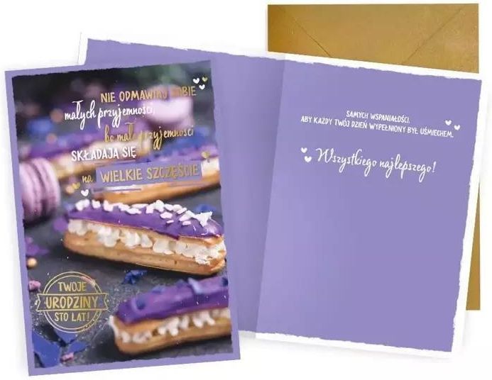 Kartka na Urodziny - Passion Premium z nadrukiem "Twoje urodziny, Sto Lat! (eklerki)" o wymiarach B6 (16,6 cm x 11,7 cm po złożeniu). Kartki z serii Passion Premium to świetny pomysł na piękną pamiątkę, każda kartka jest zdobiona przynajmniej dwoma rodzajami uszlachetnień - metaliczne lub perłowe folie, brokat, tłoczenie itp. - tyle piękna w takim drobiazgu (uzależnione od rodzaju kartki)! Każda kartka Passion Premium ma kolorowe wnętrze z tekstem wyjątkowych życzeń i grafiką, w komplecie jest także dopasowana kolorystycznie koperta. Karnety, znane również jako kartki, to uniwersalny produkt, który znajduje zastosowanie w wielu sytuacjach. Mogą być używane jako kartki z okazji różnych uroczystości, takich jak urodziny, śluby, chrzty czy Boże Narodzenie, ale również jako karty podziękowania lub życzenia powrotu do zdrowia. Uniwersalność - karnety można wykorzystać w różnych sytuacjach, od urodzin po Boże Narodzenie, dzięki czemu są to uniwersalne prezenty. Osobisty charakter - wpisanie własnych życzeń i dedykacji na karcie sprawia, że prezent staje się bardziej osobisty i dedykowany konkretnemu odbiorcy. Estetyka - karnety zazwyczaj są bardzo estetyczne i eleganckie, co dodaje im wartości jako prezentu.