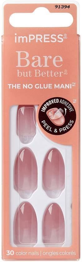 Gołe, ale lepsze, bez dużej ilości kleju? Tak dziękuję! Znajdź idealny manicure nude z kolekcją imPRESS Color Bare but Better i stwórz najmodniejszy look. Dzięki nowemu, ulepszonemu klejowi paznokcie są wyjątkowo trwałe i utrzymują się aż do 7 dni.Sposób użycia: