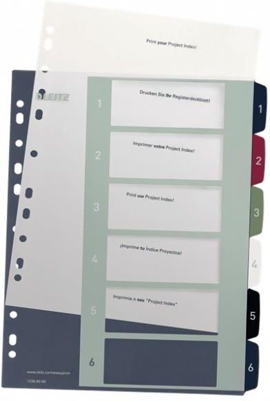 Przekładki do wielokrotnego użytku, bardzo wytrzymałe, w wyrafinowanej kolorystyce. Z kartą do indywidualnego zadruku na komputerze. możliwość wydruku spisu treści z komputera za pośrednictwem formularza umieszczonego na stronie: www.leitz.com/easyprint mocny, przezroczysty PP o grubości 0,3 mm format A4+ pozwala na szybki dostęp do dokumentów, nawet w przypadku przechowywania ich w koszulkach 20 zadrukowanych numerycznie przekładek (1-20) do łatwego sortowania 11 uniwersalnych otworów umożliwiających wpinanie do segregatora