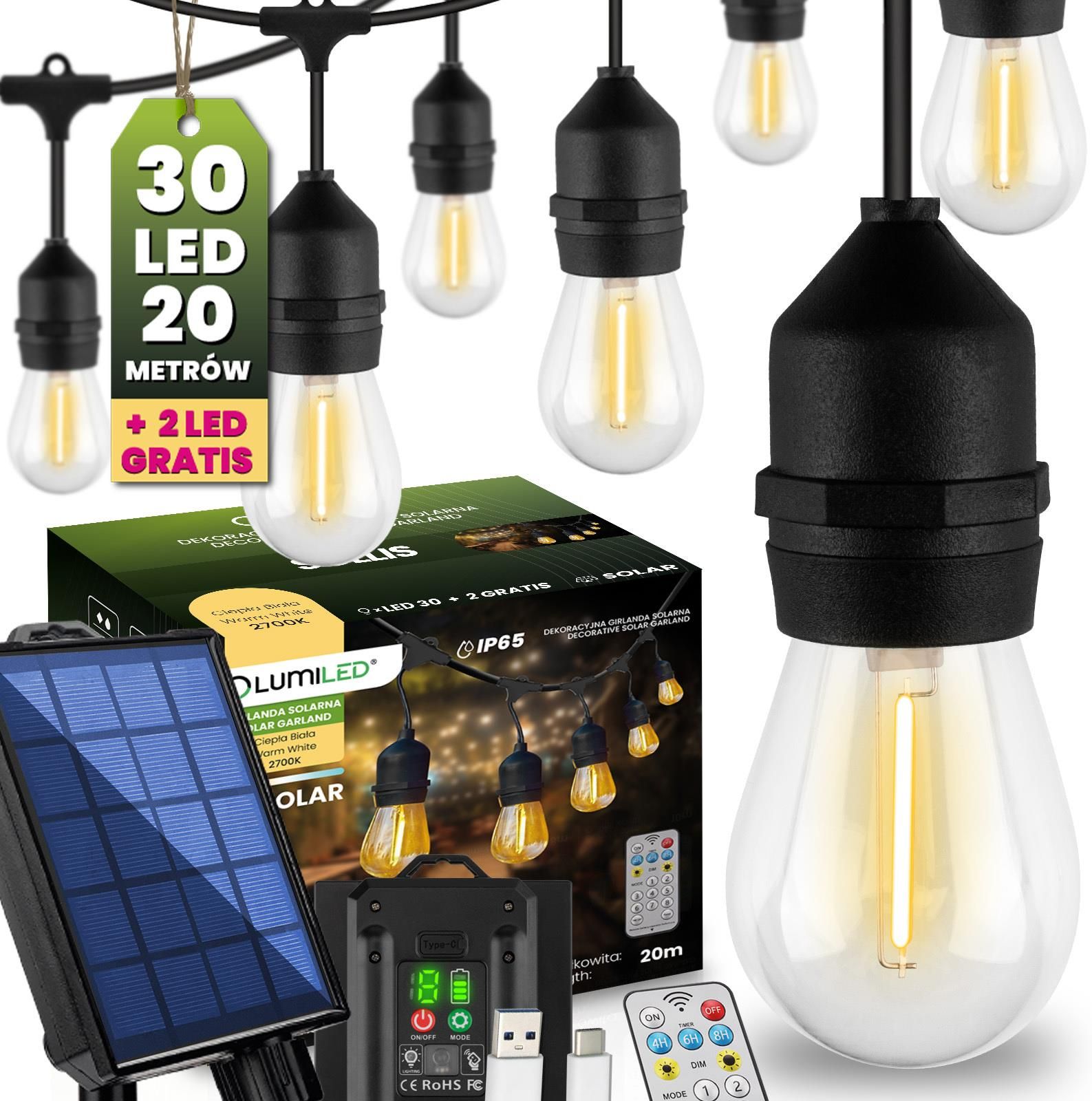 Girlanda Solarna Ogrodowa 30x LED Ozdobne Żarówki 20m + PILOT IP65 2700K Ciepła SOLLIS LUMILED Girlanda SOLLIS 20m z 30 żarówkami LED E27 to efekt naszego doświadczenia – gęstsze rozmieszczenie świateł (co 62 cm) daje lepszy klimat, równomierne oświetlenie i efekt bez ciemnych przerw. To przewaga, …